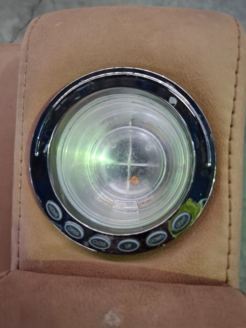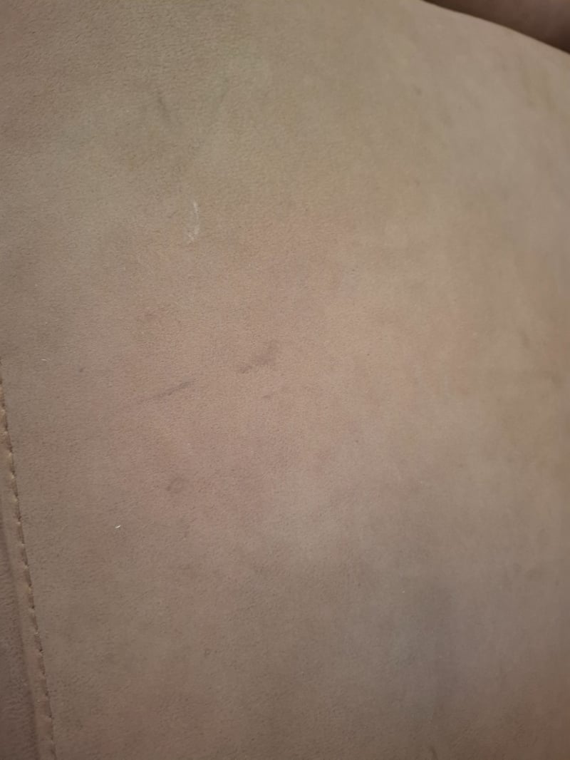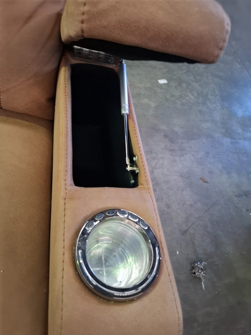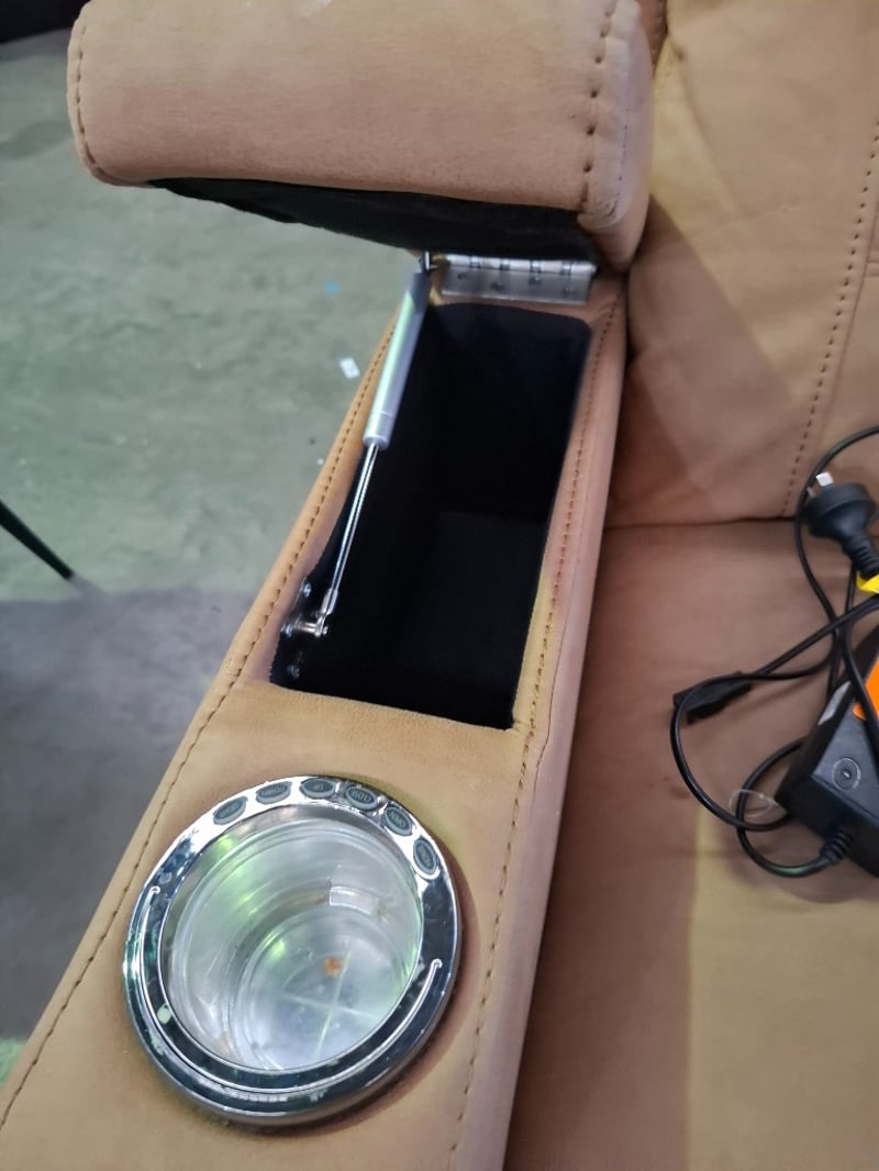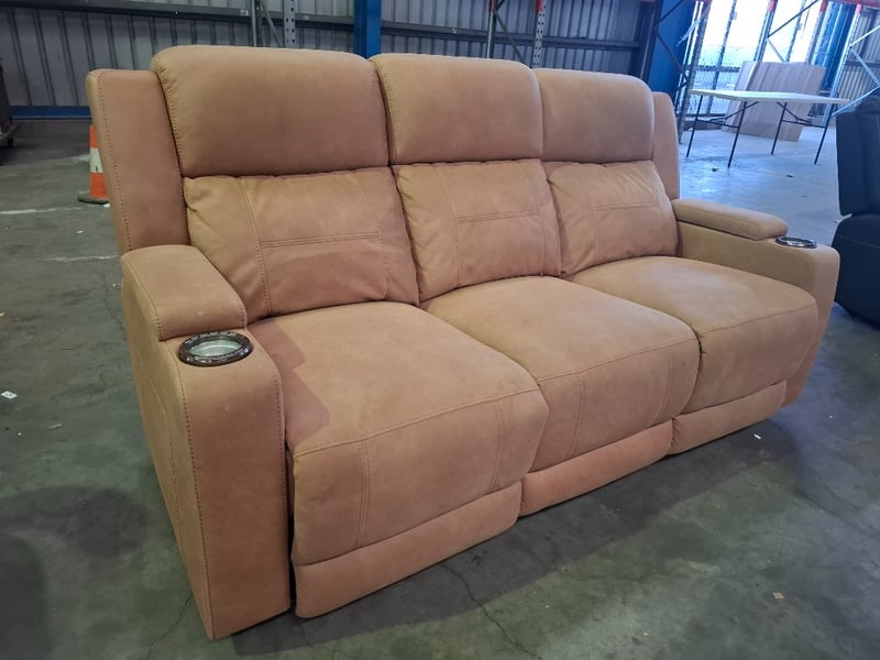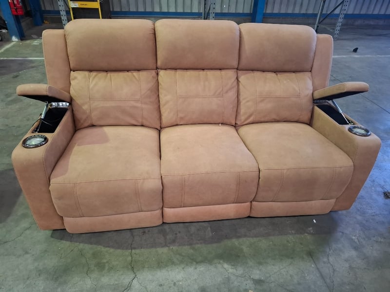 3 seaters electric recliner, Natural colour leather style, gas lift storage compartment, 2 cups holder, Led lights Dimensions: 196 cm ( W) x 100 cm ( D) 102 x cm ( H)NOTE: STAINS AND MARKS PRESENT, CLEANING REQUIRED