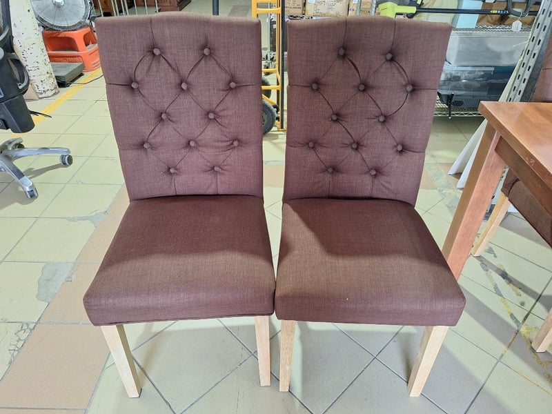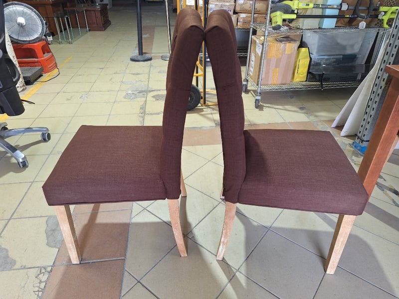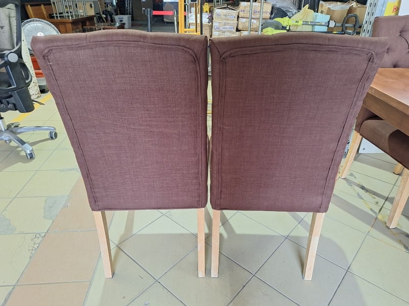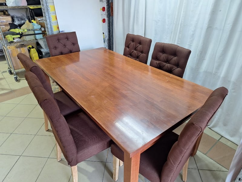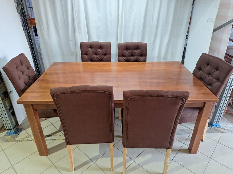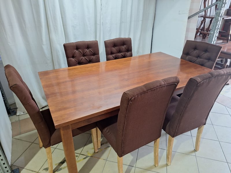 6-Seater Dining Table, Cushion Chairs, Timber Style, Brown Finish Dimensions Chair H:99cm W:48cm D:52cm Dimensions Table H:76cm W:181cm D:101 SOLD AS LOT