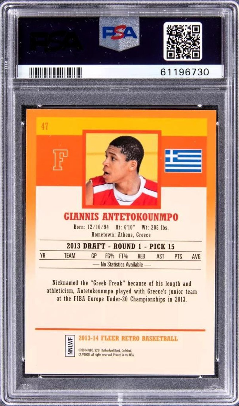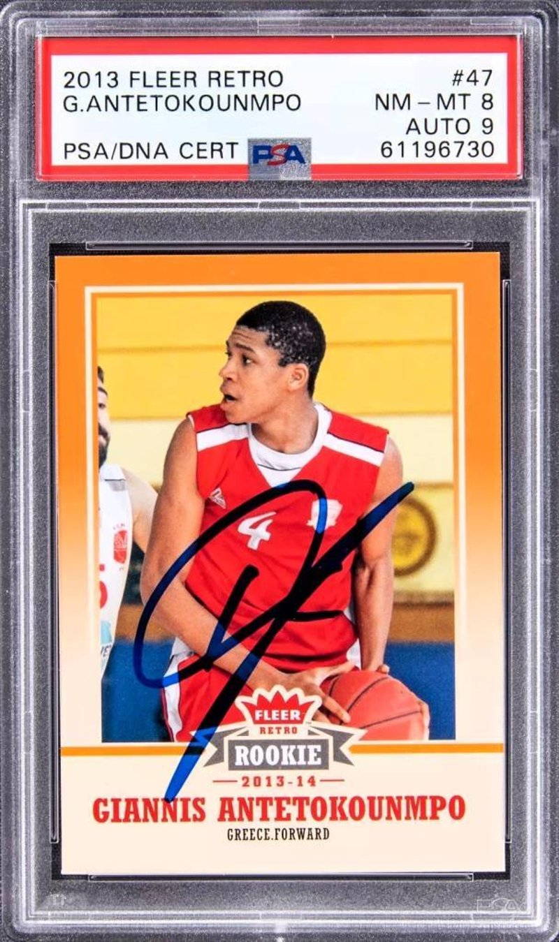 2013-14 FLEER RETRO GIANNIS ANTETOKOUNMPO #47 RCA – PSA/DNA AUTHENTICATED On-Card Signature - A Rare Rookie-Year Fleer Retro Issue Of “The Greek Freak” – Authenticated Signature By Psa/Dna - Nba Basketball Overview: Offered Here Is A 2013-14 Fleer Retro #47 Giannis Antetokounmpo Rca, Bearing An Authenticated Autograph And Certified By Psa/Dna. Issued During Giannis’S Rookie Season, This Card Forms Part Of The Highly Regarded Fleer Retro Set, Which Pays Tribute To Classic 1990S Upper Deck And Fleer Designs. The “Rca” (Rookie Card Autograph) Variant Is Especially Coveted, As It Combines A Throwback Aesthetic With A Genuine Signature From The Player’S Debut Nba Year. With His Rise From Unheralded Prospect To Two-Time Nba Mvp And Nba Champion, Authenticated Rookie-Era Cards Of Giannis Are Increasingly Sought After Across All Grading Tiers. Key Features: This Card Features Giannis In His Milwaukee Bucks Uniform, Captured In A Stylised Action Pose Consistent With The Bold, Nostalgic Layout Of The Fleer Retro Series. The Signature, Boldly Penned In Blue Ink Across The Card Front, Has Been Fully Certified By Psa/Dna And Encapsulated For Authenticity. The Retro Design Cues Reference Fleer’S Mid-90S Legacy While Incorporating Modern Photography And Production Techniques. This Combination Of Vintage Inspiration And Contemporary Significance Makes The Card A Standout Among Early Giannis Issues. Why This Card Is Collectable: Giannis Antetokounmpo’S Meteoric Ascent Has Established Him As One Of The Defining Players Of The Modern Nba Era. Rookie-Season Autograph Cards Carry Added Weight In The Hobby, And This Fleer Retro Entry Is Particularly Desirable Due To Its Dual Appeal As Both A Signed Piece And A Design Homage To The Golden Era Of Basketball Cards. Psa/Dna Certification Further Enhances The Card’S Long-Term Viability And Ensures Peace Of Mind For Collectors Seeking Authentic Player-Signed Material From Key Points In A Superstar’S Career. As The Hobby Continues To Prioritise Low-Population, Rookie-Period Autographs, This Card Is Well-Positioned To Retain And Grow In Significance. Collector Appeal: This Is An Ideal Acquisition For Collectors Focused On Rookie Autographs, Psa-Certified Memorabilia, Or Long-Term Investment In Giannis’S Earliest Nba Issues. The Blend Of Throwback Style, On-Card Signature, And Psa/Dna Encapsulation Positions The Card As A Centrepiece In Any Modern Basketball Collection. It Is Equally Well-Suited To Thematic Displays Or Inclusion In Investment-Grade Holdings Where Authentic Autographed Rookie Content Is Prioritised. 584976+1