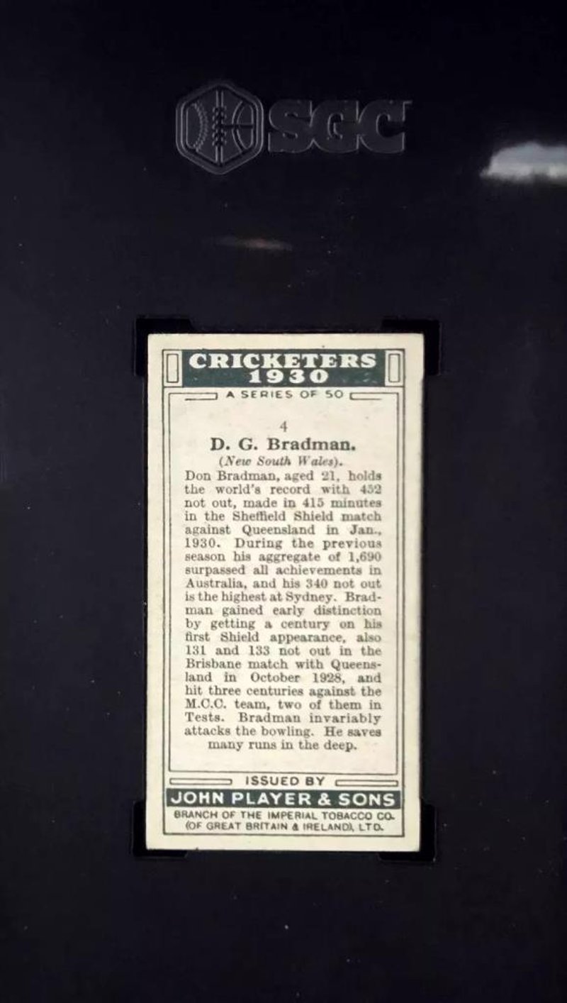 1930 JOHN PLAYER & SONS CRICKETERS #4 SIR DONALD BRADMAN – SGC 4.5 VG-EXA Rare And Revered Early-Issue Don Bradman Tobacco Card – Authenticated By Sgc - Cricket Don BradmanOverview:Presented Here Is An Outstanding Example Of The 1930 John Player & Sons Cricketers #4, Featuring None Other Than Sir Donald Bradman, Widely Regarded As The Finest Batsman In The History Of Cricket. Graded Sgc 4.5 (Very Good To Excellent), This Card Is Part Of The Celebrated Player'S Cigarettes Series, Distributed In Tobacco Packets During The Golden Era Of British And Australian Cricket. Issued In The Same Year Bradman Took The Ashes By Storm With His 974-Run Tour Of England, This Card Holds A Seminal Place In Both Cricketing And Collecting History.Key Features:This Card Captures A Young Bradman At The Outset Of His Legendary Career, Rendered In The Tasteful Black-And-White Photographic Style That Characterises The Set. The Front Features A Clean Image Of “The Don” In Cricket Whites, Framed By The Series' Classic White Border. The Reverse Offers A Biographical Summary And A Description Of His Then-Nascent Achievements, Making This An Insightful Period Artefact. Though The Sgc 4.5 Grade Reflects Moderate Handling And Wear Consistent With Its Age, The Card Retains Strong Visual Integrity, Particularly In Terms Of Centring, Print Clarity, And Surface Appeal.Why This Card Is Collectable:The 1930 Player'S Bradman Issue Is A Cornerstone For Any Serious Cricket Card Collection. It Marks A Pivotal Moment In Sporting History, Coinciding Directly With Bradman’S Ashes Exploits And The Beginning Of His International Fame. Tobacco Cards From This Period Have Long Since Entered The Realm Of Cultural Memorabilia, Especially Those Depicting Figures Of Such Enduring Global Significance. With Comparatively Few Surviving In Graded And Encapsulated Condition, Especially Outside Institutional Holdings, This Card Represents A Rare Convergence Of Historic Timing, Scarcity, And Subject Matter.Collector Appeal:This Item Is Ideal For Collectors Of Early 20Th-Century Sporting Ephemera, Bradman-Specific Collections, Or High-Quality Vintage Cricket Memorabilia. The Sgc Encapsulation Ensures Authenticity And Secure Preservation, Making It Suitable For Display Or Inclusion In Historically Focused Portfolios. With The Continuing Reverence For Bradman’S Statistical And Cultural Legacy, This Card Offers Both Prestige And Long-Term Significance.584976+4