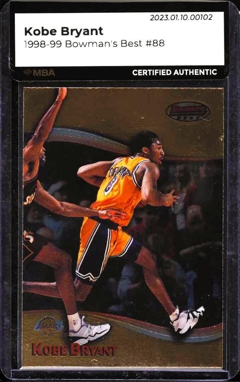 1998 BOWMAN'S BEST KOBE BRYANT #88 – MBA AUTHENTICATEDA Late-1990S Premium-Era Kobe Bryant Insert With Brilliant Foil Finish – Authenticated By Mba - Nba Basketball LakersOverview:Featured Here Is The 1998 Bowman'S Best Kobe Bryant #88, A High-Quality Issue From One Of Topps' Premier Chromium-Based Product Lines Of The Late 1990S. This Card Has Been Officially Authenticated By Mba (Memorabilia Authentication), Offering Assurance Of Its Originality And Legitimacy. Issued During Kobe Bryant’S Third Nba Season, It Captures The Rising Star As He Transitioned From Promising Talent To Fully-Fledged Franchise Leader For The Los Angeles Lakers.Key Features:This Card Boasts A Chromium-Style Construction With A Lustrous Foil Finish, Consistent With The Bowman'S Best Design Aesthetic Of The Era. The Card Displays Bryant In Full Lakers Kit, Mid-Game, With A Strong Visual Layout And Etched Graphics Surrounding His Portrait. The Reverse Includes A Player Profile And Highlights Bryant’S Early Impact On The League As He Gained All-Star Recognition And Growing Fan Acclaim. While Ungraded, The Card Has Been Independently Authenticated By Mba, Verifying Its Originality And Collectable Integrity.Why This Card Is Collectable:Kobe Bryant’S Cards From The Late 1990S Represent An Essential Chapter In His Storied Legacy. The 1998 Bowman'S Best Set Is Widely Appreciated For Its Production Quality, Striking Visuals, And Premium Nature—Often Viewed As A Step Above Standard Base Products Of The Time. As This Card Predates Bryant’S First Nba Championship In 2000, It Captures The Early Stage Of A Hall Of Fame Career That Would Include Five Titles, Two Finals Mvps, And A Global Cultural Legacy.Collector Appeal:This Card Will Appeal To Collectors Seeking Authentic Late-1990S Kobe Bryant Issues With A Strong Visual Profile And Reputable Third-Party Authentication. It Is A Compelling Choice For Fans Of Chromium-Era Basketball Cards, As Well As Investors Looking To Build A Portfolio Of Iconic Kobe Releases Outside The Traditional Rookie-Year Selection. The Mba Authentication Adds An Additional Layer Of Buyer Confidence.Authentication & Condition Summary:Authenticated By Mba (Memorabilia Authentication). Card Presents Well With Clean Edges, Vivid Colour, And Excellent Surface Lustre. As An Mba-Authenticated Piece, It Provides Confirmed Legitimacy For Display Or Investment Purposes. Encased In Mba’S Official Holder With Verification Label.584976+10