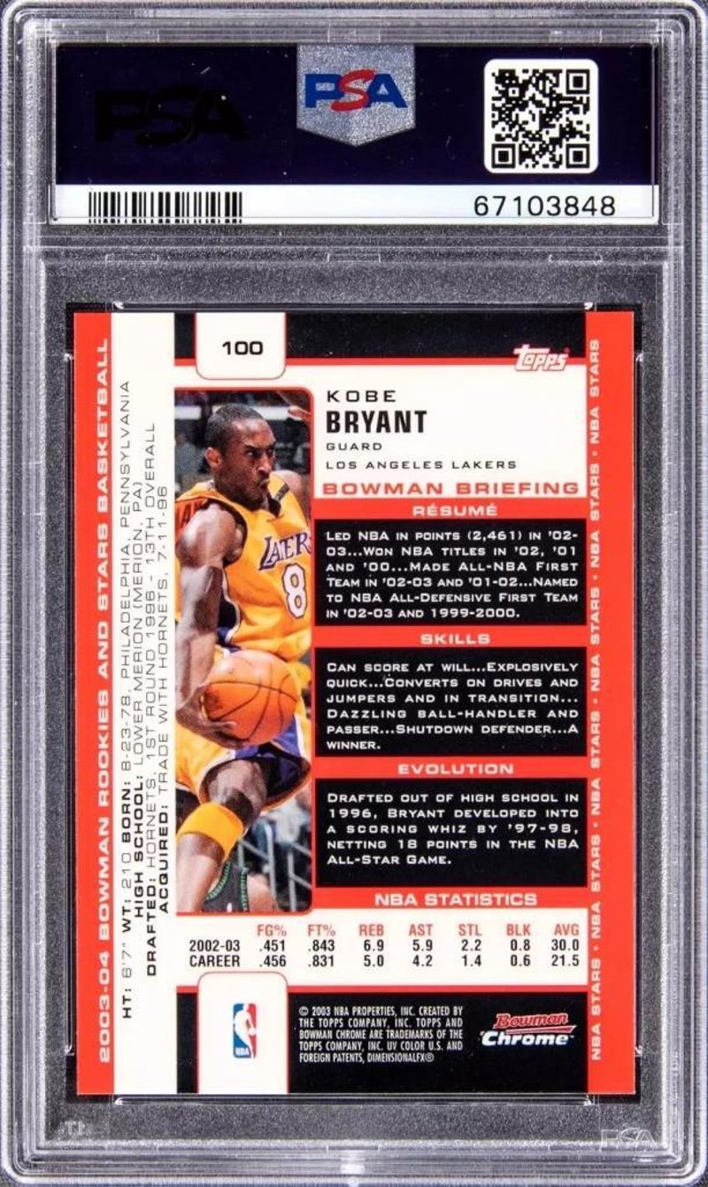 2003–04 BOWMAN CHROME ROOKIES & STARS KOBE BRYANT #100 – SHARP CHROMIUM FINISH | EARLY 2000S ICONIC ISSUEA Premium Bowman Chrome Release Featuring The Lakers Legend In His Prime Years – Scarce, Gloss-Finished Collectable - Nba LegendOverview:On Offer Is The 2003–04 Bowman Chrome Rookies & Stars #100 Featuring Kobe Bryant, A Shimmering Chromium Tribute To The Black Mamba During One Of The Most Formidable Phases Of His Storied Career. This Edition Captures Bryant In Full Stride—Just A Season Removed From A Three-Peat Nba Championship Run—Making This A Visually Striking And Historically Significant Card From Topps’ Premium Bowman Chrome Range.Released As Part Of The Celebrated Bowman Chrome Rookies & Stars Subset, This Card Is Rendered In High-Gloss, Chromium Technology, Exhibiting Vibrant Colour Saturation, Precise Detailing, And Sharp Edge Quality.Key Features:Card #100 Features Bryant In His Iconic Gold Los Angeles Lakers Uniform, Poised In Mid-Motion With Trademark Focus. The Bowman Chrome Branding Lends The Piece A Sleek, Refractive Surface Finish That Remains Highly Sought After Among Collectors Of Modern-Era Chromium Issues.The 2003–04 Season Itself Holds Considerable Significance In The Basketball Hobby, Owing To The Entrance Of Lebron James And A Renewed Collector Focus On Topps’ Chrome-Based Series. Bryant’S Presence In The Rookies & Stars Selection Adds Notable Star Power To The Checklist.Why This Card Is Collectable:As One Of The Last Bowman Chrome Basketball Issues Prior To Topps’ Departure From The Nba Licence, This Card Bridges The Vintage-Modern Transition And Remains A Favourite For Collectors Who Appreciate Early 2000S Print Quality. Kobe Bryant’S Status As A Five-Time Nba Champion, 18-Time All-Star, And Basketball Hall Of Famer Ensures His Cards From All Eras Remain Relevant, With Chromium And Refractor-Style Issues Enjoying Consistent Long-Term Demand.Though Not A Rookie Card, This Release Captures Bryant At The Height Of His Influence, Providing A Powerful Portrait Of His Peak Form.Collector Appeal:A Must-Have For Fans Of Kobe Bryant, Lakers Completists, And Chrome Card Specialists. This Card Balances Eye-Catching Design With Era Significance, Serving As A Prime Example Of Topps’ Commitment To Sharp Photographic Presentation And Premium Finishes During The Early 2000S. It Is Also Well Suited For Investors Seeking Clean, Mid-Career Kobe Inserts As Alternatives To High-Cost Rookie Options.584976+22