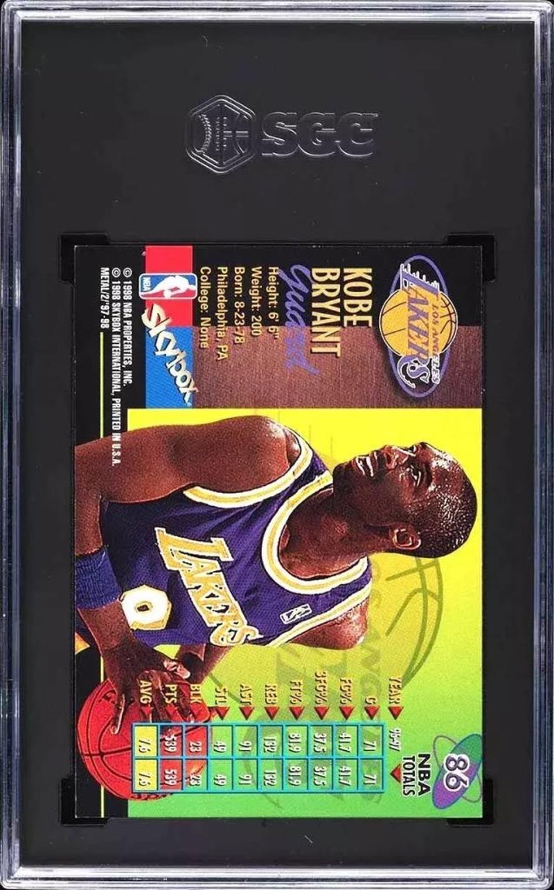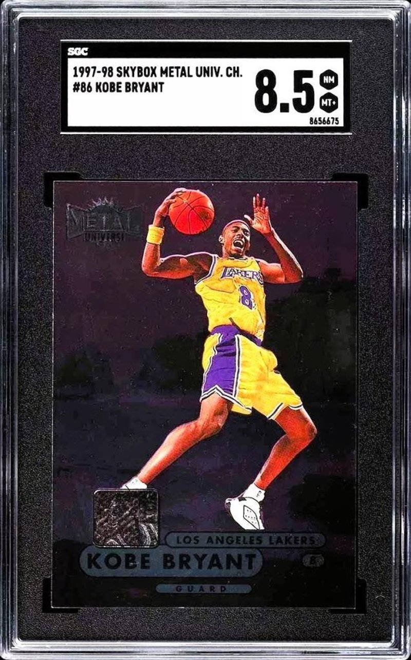 1997 METAL UNIVERSE CHAMPIONSHIP KOBE BRYANT #86 – SGC 8.5 NM-MT+ | EARLY-ERA KOBE WITH EYE-CATCHING DESIGN NBA BASKETBALL TRADING CARDThis Listing Featured A 1997 Metal Universe Championship #86 Kobe Bryant Card, Graded Sgc 8.5 (Near Mint–Mint+) – A Visually Striking And Increasingly Sought-After Issue From One Of The Most Inventive Basketball Card Sets Of The Late 1990S.Card Details:- Player: Kobe Bryant (Los Angeles Lakers)- Card Number: #86- Series: 1997-98 Metal Universe Championship Basketball- Grading: Sgc 8.5 (Nm-Mt+)Encapsulation: Professionally Slabbed And Certified By SgcThe Metal Universe Championship Line Is Widely Recognised For Its Bold, Imaginative Designs, Metallic Finishes, And Futuristic Backdrops—True Hallmarks Of Late-90S Skybox Innovation. This Particular Kobe Card Showcases A Young Bryant During His Early Rise To Stardom, Surrounded By Intricate Textures And Dynamic Detail.Graded Sgc 8.5, This Example Delivers Excellent Surface Condition, Sharp Corners, And Strong Centring, Offering A Premium Aesthetic In A Highly Respected Grade. Cards From This Set Are Notoriously Condition-Sensitive Due To The Complex Foil And Print Layering, Making High-Grade Examples Especially Desirable.Collectors Value This Card For:- Its Position Within A Cult-Favourite Skybox Metal Insert Line- Early-Career Imagery Of Kobe Before His First Title Run- Strong Mid-High Grade From Sgc, Ideal For Both Display And Investment584976+27