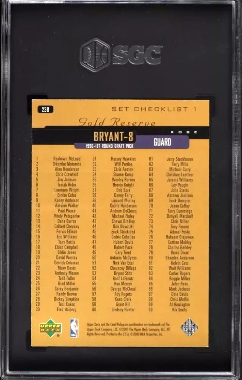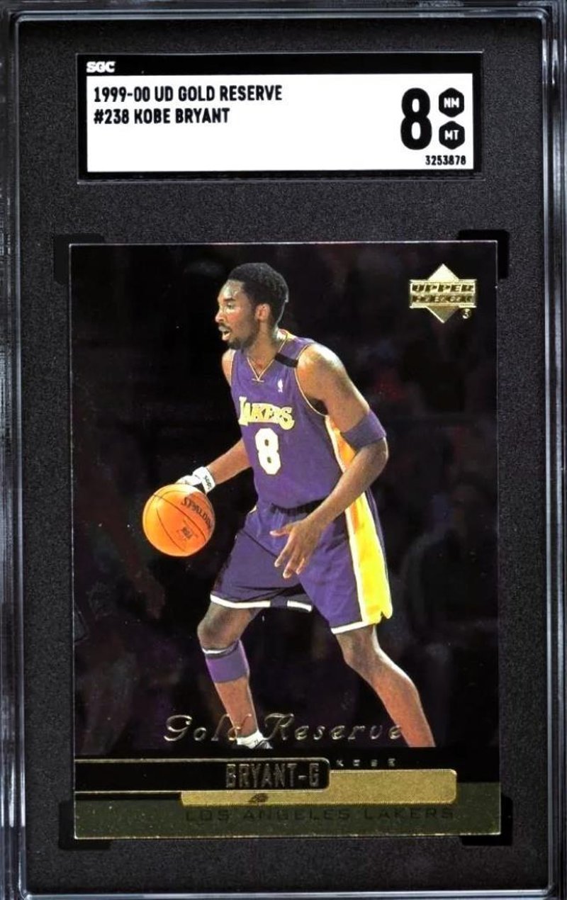 1999 UPPER DECK GOLD RESERVE KOBE BRYANT #238 – SGC 8 NM-MT | PREMIER LATE-90S LAKERS ISSUE IN GOLD FOILA High-Grade, Gold-Accented Tribute To Kobe Bryant From The Refined 1999 Upper Deck Gold Reserve Series – Graded Sgc 8 And Ready For Proud Inclusion In Your Premium Card Collection. Nba Basketball Trading CardOverview:On Offer Is The 1999 Upper Deck Gold Reserve Kobe Bryant #238, Graded Sgc 8 (Near Mint-Mint). This Release Stands As One Of The More Visually Refined Cards Of The Late 1990S, Combining Upper Deck’S Trademark Sharp Photography With An Elegant Gold Foil Parallel Finish That Distinguished The Gold Reserve Line From Standard Issues. Capturing Kobe In Full Flight As He Transitioned Into The League'S Elite Tier, This Card Remains A Worthy Addition To Any Collection Focused On His Early Years.Key Features:Card #238 Presents Kobe Bryant In Action For The Los Angeles Lakers, Mid-Play, Exuding Both Athleticism And Intensity. The Card’S Design Features Premium Metallic Gold Trim, Embossed Nameplate And The Distinct Gold Reserve Insignia, Signalling Its Elevated Status Within The 1999 Upper Deck Portfolio. At The Time Of Release, Kobe Was Already An All-Star And On The Cusp Of Championship Greatness—Making Cards From This Period Increasingly Desirable. The Sgc 8 Grade Certifies This Example As Well-Preserved, With Strong Surface Gloss, Vibrant Colour And Sharp Edges, Indicative Of Minimal Wear And Careful Handling.Why This Card Is Collectable: The Upper Deck Gold Reserve Series Offered Collectors A Premium Alternative To The Base Upper Deck Range, Produced In Relatively Limited Quantities And Geared Toward Presentation-Quality Finishes. Cards Featuring Kobe From The 1998–2000 Window Have Seen Increasing Appreciation, As This Era Marked The Beginning Of His Three Consecutive Nba Championships. Notably, This Card Features Kobe Just Before The Lakers’ Dynasty Truly Took Hold, Lending It Both Historical And Narrative Significance. With The Gold Reserve Line No Longer Produced, These Cards Remain Highly Collectable For Those Seeking Quality Over Quantity.Collector Appeal:This Card Appeals To Kobe Bryant Collectors, Fans Of Premium Late-90S Sets, And Those Building Graded Collections With An Emphasis On Quality Visual Presentation. The Sgc 8 Grade Ensures Strong Preservation While Maintaining Accessibility. It’S An Excellent Candidate For Display And Long-Term Holding In Any Curated Basketball Portfolio.584976+28