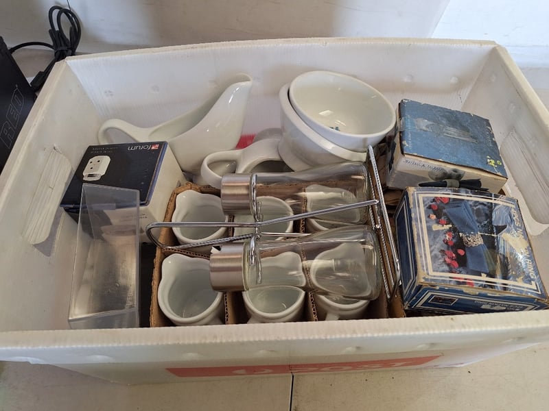 Assorted Box Lot, Glassware, Egg Holder, Bowls, Sauce Bowls, Salt Shaker