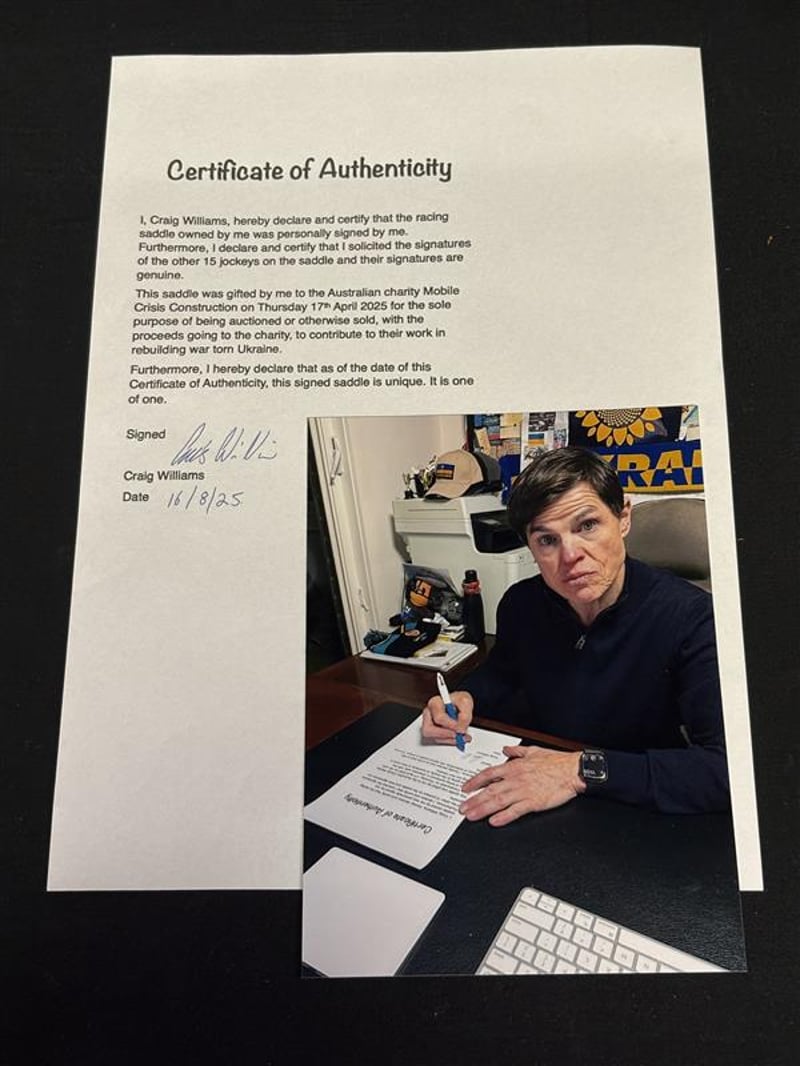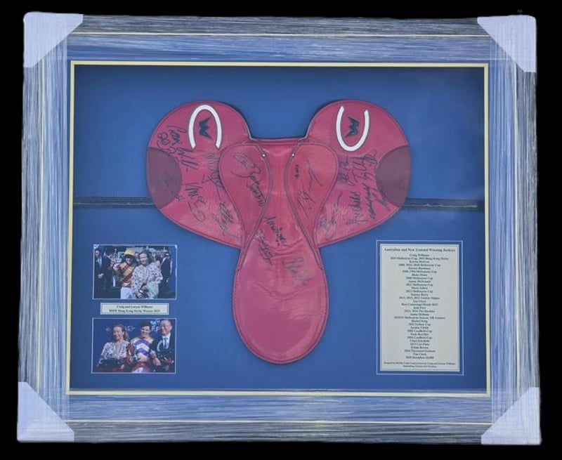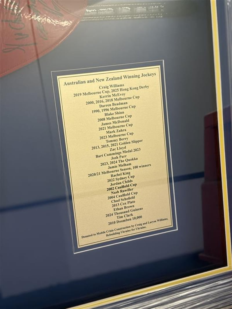 FRAMED RACING SADDLE – SIGNED BY 16 CHAMPION JOCKEYS SIGNATURES INCLUDE: CRAIG WILLIAMS – 2019 MELBOURNE CUP, 2025 HONG KONG DERBY KERRIN MCEVOY – MELBOURNE CUP 2000, 2016, 2018 DARREN BEADMAN – MELBOURNE CUP 1990, 1996 BLAKE SHINN – MELBOURNE CUP 2008 JAMES MCDONALD – MELBOURNE CUP 2021 MARK ZAHRA – MELBOURNE CUP 2023 TOMMY BERRY – GOLDEN SLIPPER 2013, 2015, 2021 ZAC LLOYD – PRESTIGIOUS BART CUMMINGS AWARD JOSH PARR – THE QUOKKA 2023 & 2024 JAMIE MELHAM – 2020/21 MELBOURNE SEASON (100 WINNERS) RACHEL KING – SYDNEY CUP 2022 JORDAN CHILDS – CAULFIELD CUP 2022 NASH RAWILLER – CAULFIELD CUP 2004 CHAD SCHOFIELD – COX PLATE 2013 ETHAN BROWN – THOUSAND GUINEAS 2024 TIM CLARK – DOOMBEN 10,000 2010 Includes Certificate Of Authenticity Signed By Craig Williams. Professionally Framed And Presented. All Signatures Appear Clearly On The Saddle, Beautifully Mounted On Blue Fabric Background With Supporting Photos And Brass-Plate Name Plaque. Perfect For Collectors, Racing Enthusiasts Or Charity Supporters. All proceeds from this sale will go to Mobile Crisis Construction. Mobile Crisis Construction (MCC) was established to accelerate a return to normality in disaster zones by deploying mobile brick factories that crush rubble to be pressed into interlocking bricks for the rapid rebuilding of shelter and critical infrastructure. We currently have one factory in Ukraine and are raising funds for our second factory which we plan to deploy to a second charitable organisation based in Kiev. MCC's mantra is to: Deploy: We send a mobile factory, housed in a container, to the affected disaster zone. Engage: We discuss requirements and resources with the affected community and those NGO’s which also have a presence in the disaster zone. Repurpose: Our mobile factories crush the rubble from destroyed buildings and produce new interlocking bricks. Rebuild: We rapidly rebuild community infrastructure such as schools, clinics and shelters with the full involvement of those affected. Visit MCC's website at www.crisisconstruction.org Condition: Good - Refer To Images SR 233440+1
