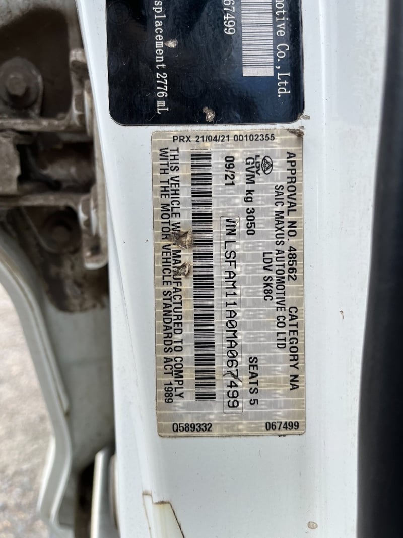 2021 LDV T60 PRO 4x4 Year: 2021Make: LDVModel: T60 ProEngine: 2.8LTransmission: Auto Odometer Indicated: 87152VIN: LSFAM11A0MA067499Fuel: DieselSeats: 5 Colour: WhiteDescription: Various paint chips & marks from removal of decals.#CTMLocation: Sarina, Mackay, 4737Contact: Bradley Taylor - 0473425094 - [email protected]Please be advised that, in accordance with Schedule 11 of the Biosecurity Regulation 2016, all machinery, equipment, and vehicles must be thoroughly cleaned of soil, organic matter, and other potential contaminants prior to leaving this site. This is a critical measure to prevent the potential spread of fire ants and to ensure compliance with biosecurity obligations. We appreciate your cooperation in helping to protect our environment and agricultural industries