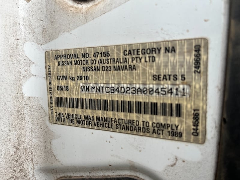 2018 Nissan Navara SL D23 4x4Year: 2018 Make: NissanModel: Navara SL D23Engine: 2.3LTransmission: 6 Speed Manual Odometer Indicated: 213,113Fuel: DieselSeats: 5Colour: WhiteVIN: MNTCB4D23A0045411Description: Various paint chips from decal removal, RHS front suspension has tail shaft/uni joint fault.#CTMLocation: Sarina, Mackay, 4737Contact: Bradley Taylor - 0473425094 - [email protected]Please be advised that, in accordance with Schedule 11 of the Biosecurity Regulation 2016, all machinery, equipment, and vehicles must be thoroughly cleaned of soil, organic matter, and other potential contaminants prior to leaving this site. This is a critical measure to prevent the potential spread of fire ants and to ensure compliance with biosecurity obligations. We appreciate your cooperation in helping to protect our environment and agricultural industries