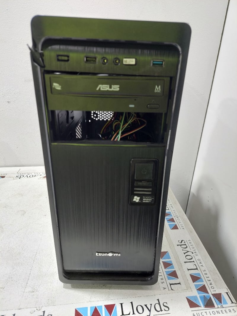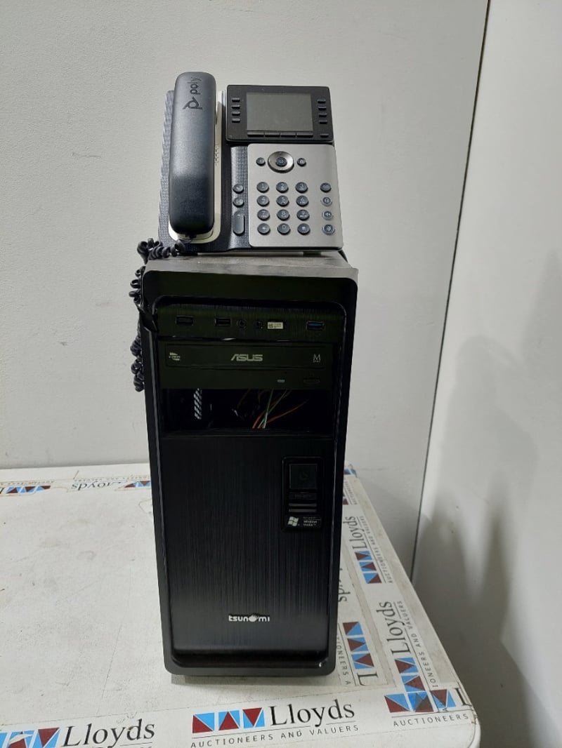 Tsunami brand computer with an Asus optical drive installed along with a Poly Edge E350 IP desk Phone.