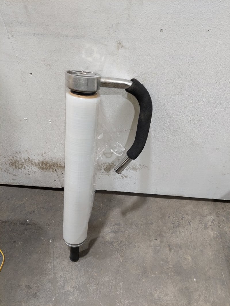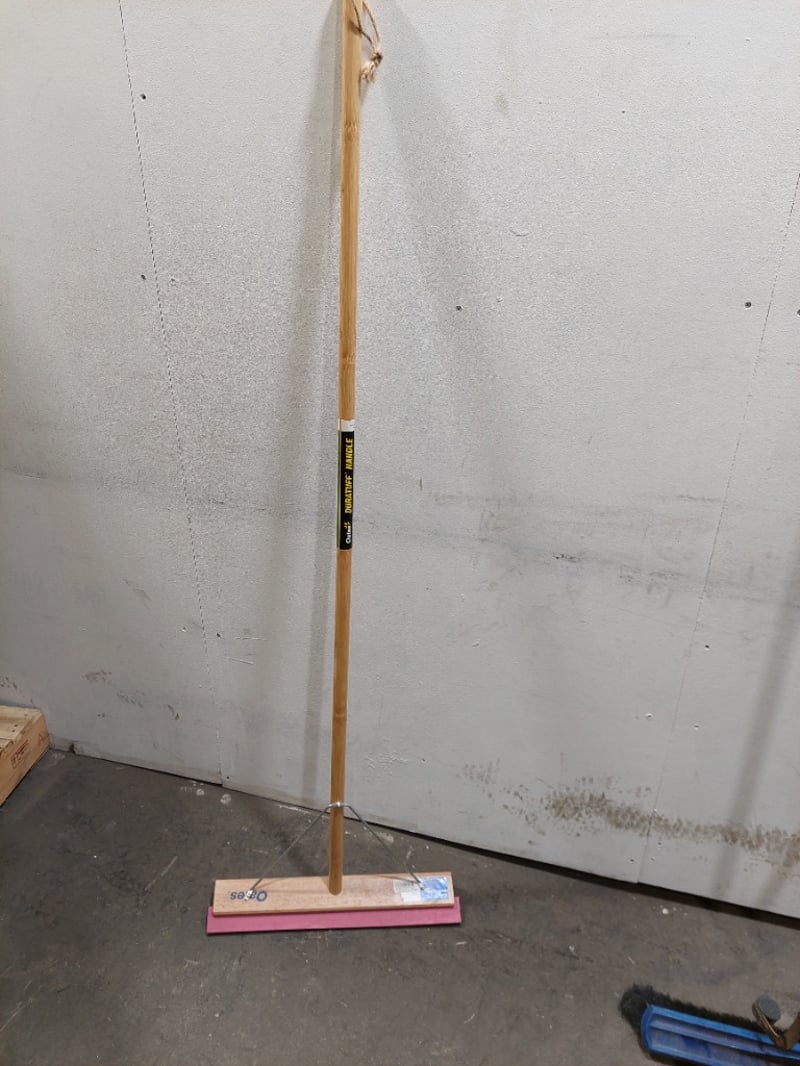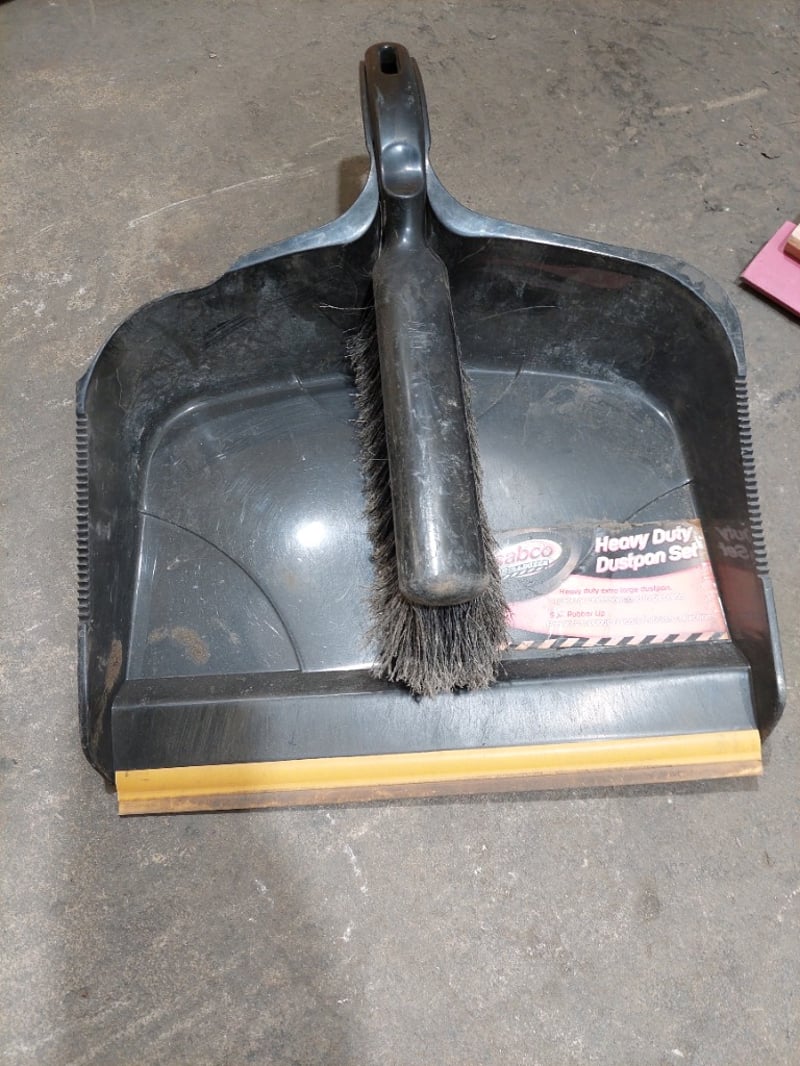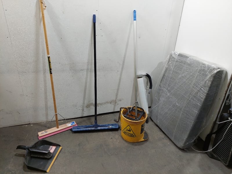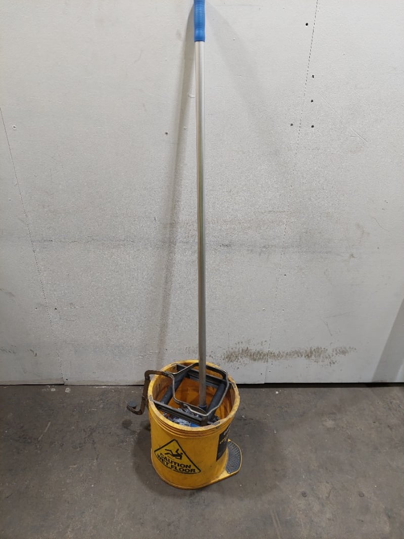 Assorted items, including broom, mop and bucket, broom and dustpan, roll of cling wrap. Note: signs of wear and tear. Sold as a lot.