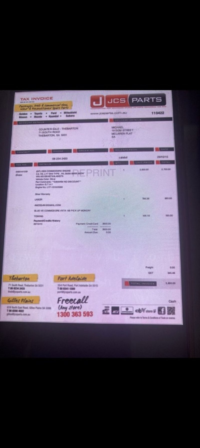 ** This vendor is not registered for GST - therefore GST is not applicable on this asset **