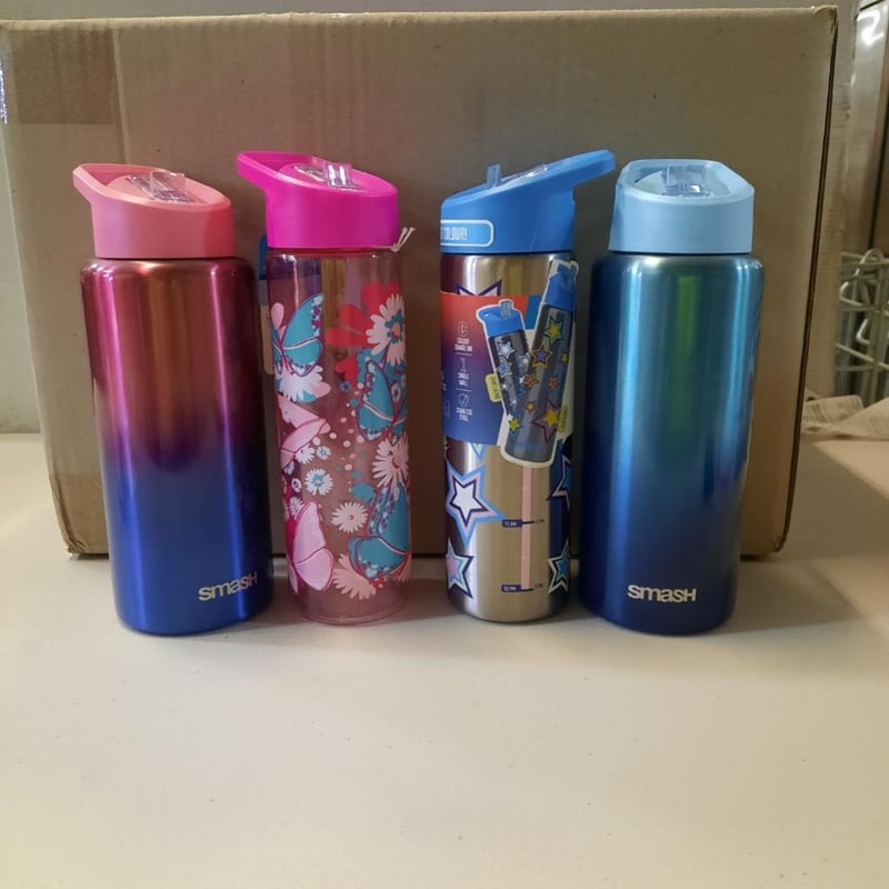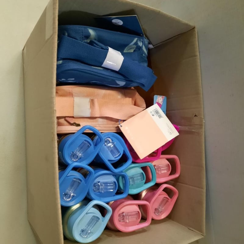 BOX OF ASSORTED GOODS, ASSORTMENT OF WATER BOTTLES, LUNCH BOXES