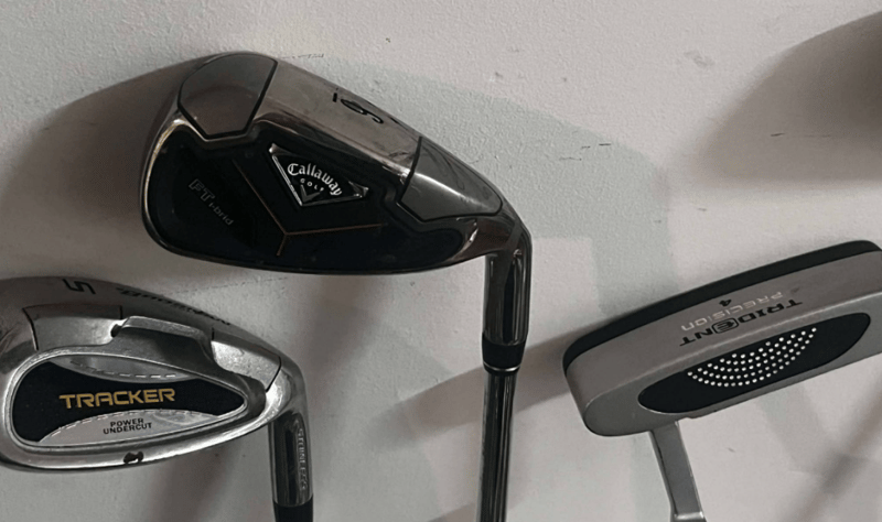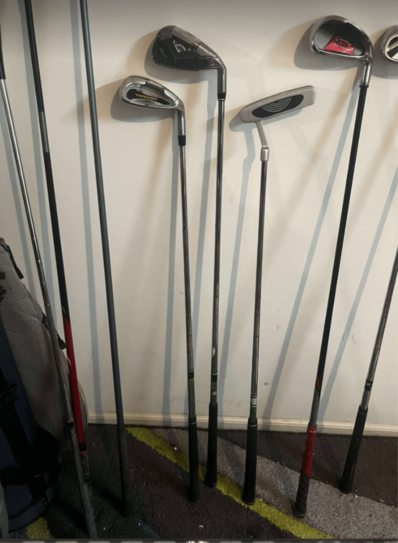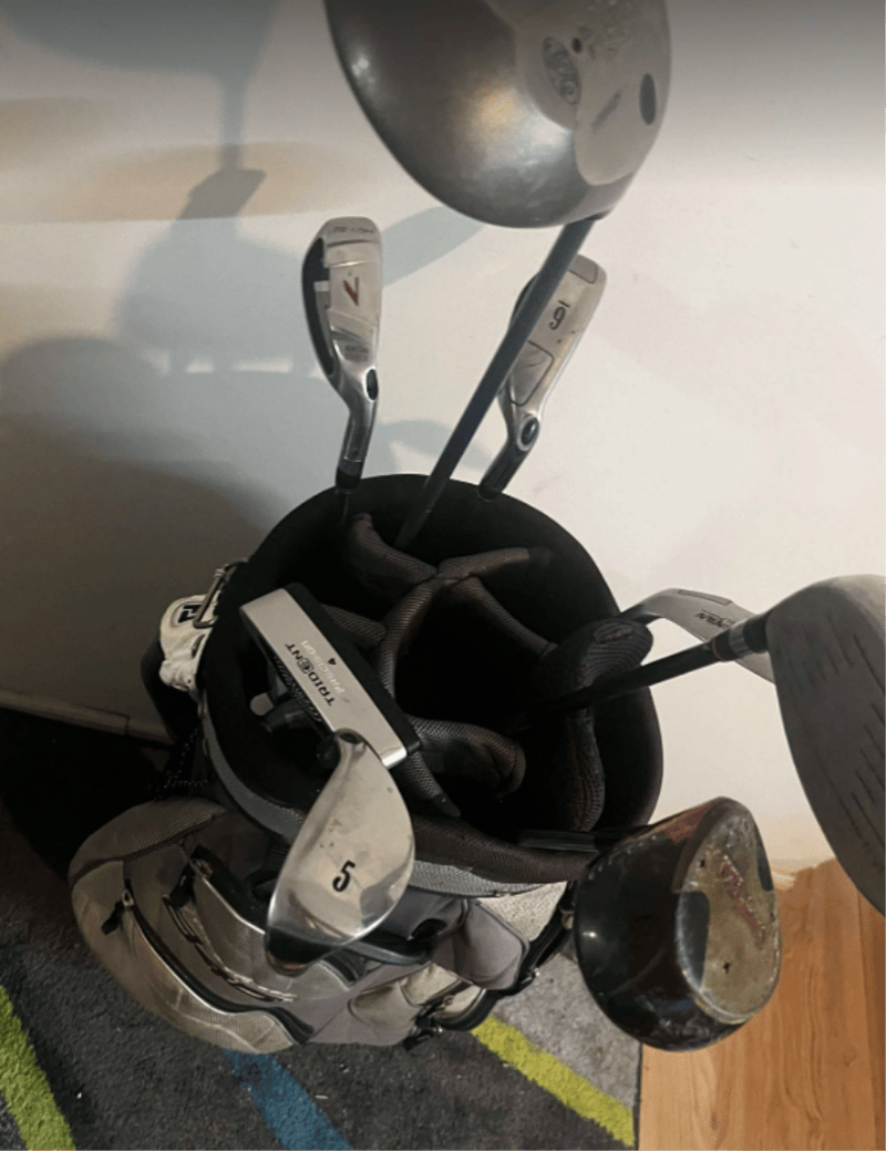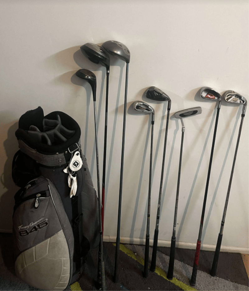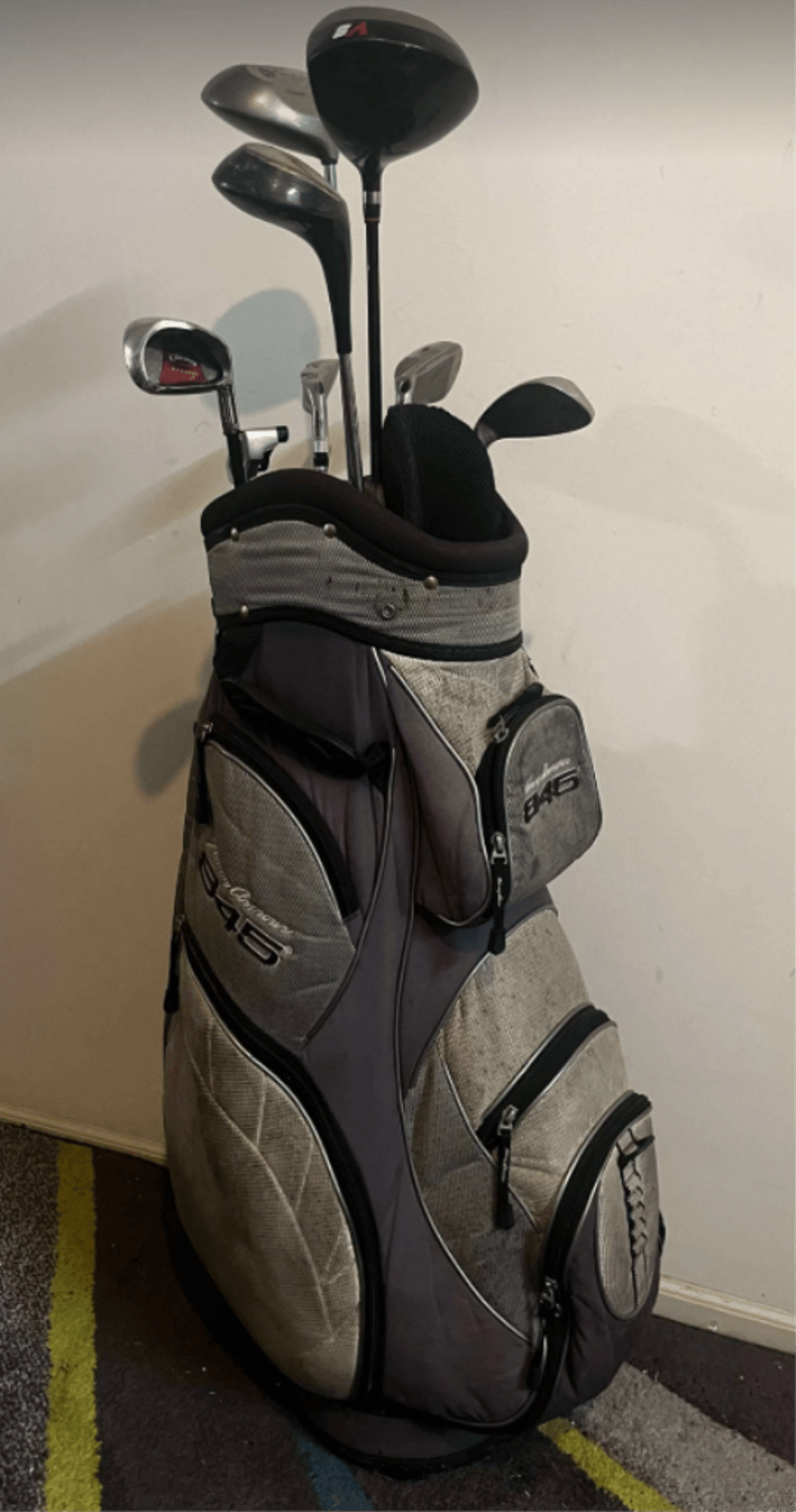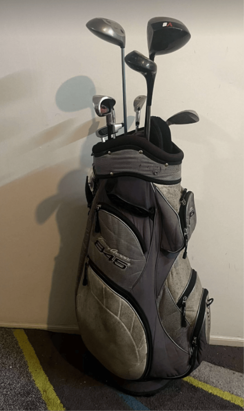 Tommy Armour Golf bag (marks present) with golf clubs – Mixed Brands such as Callaway, trident, brosnan, S2 max, PGF). Head covers in golf bag – refer to images.