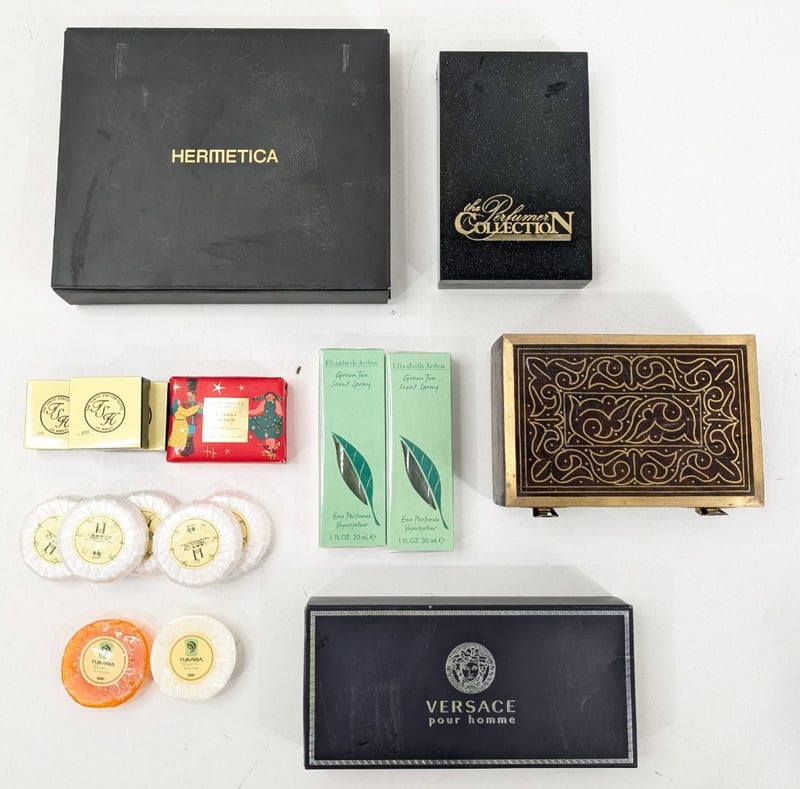 ASSORTED PERFUMES, Timber Box for Perfume Essence, Collectables Mignones, Versace Pour Homme, Assorted Soaps