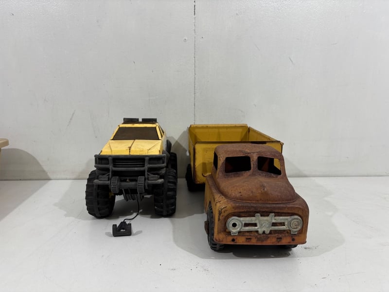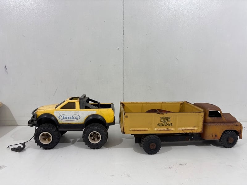 Assorted collectable toy vehicles, includes Tonka pick up truck and metal frame Sand and Gravel Truck.