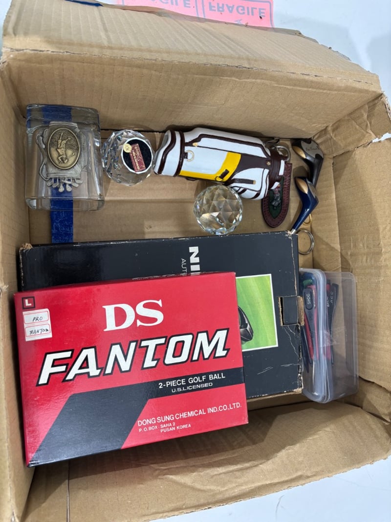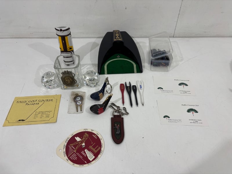 Assorted Golf collectable, Assorted Accessories and cards, includes Gold Bag pen holder, Cup and golf themed Crystals, Keychains, Auto-return putting machine and more