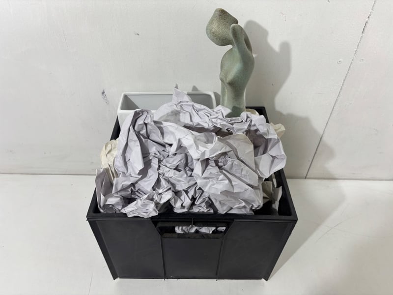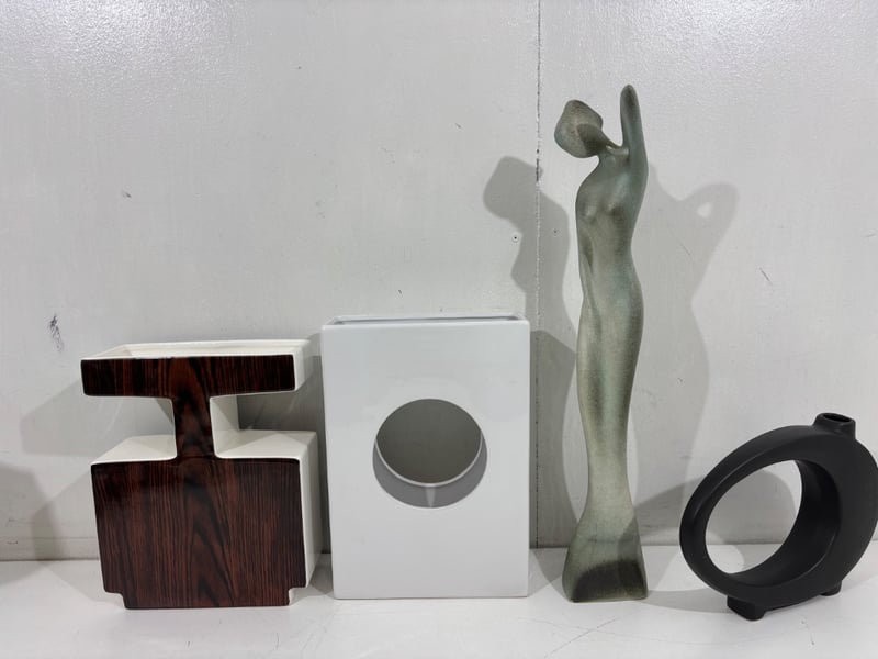Assorted lot of home decors, Ceramic pieces by My Maison, The collection includes a vase with a wood-grain pattern, a white vase with a circular cutout, a tall sculpture of a human figure, and a blackSold as lot