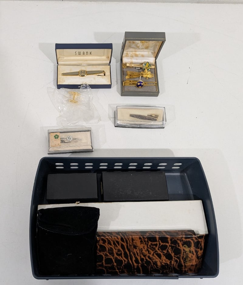 Assorted vintage accessories, assorted tie pins, clips and bag hangers Sold as Lot