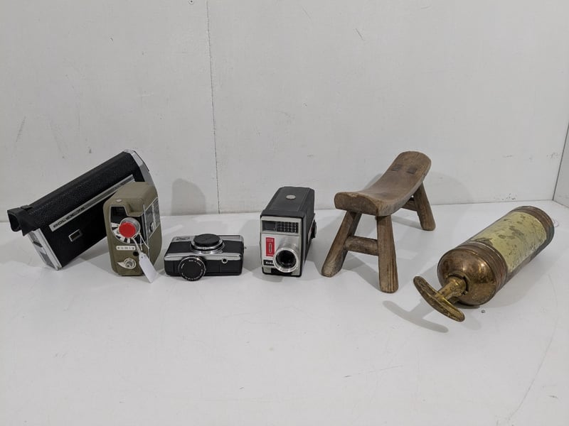 Assorted vintage Cameras and recorder's, assorted brands and styles, includes Escort 8 Kodak Camera, Eumig Electric movie camera, Bolex 7.5 Macrozoom Super 8 Camera, Pyrene brass pump-action fire extinguisher and more