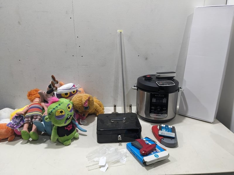 Assorted items includes, cartoon plush toys, pressure cooker and more...