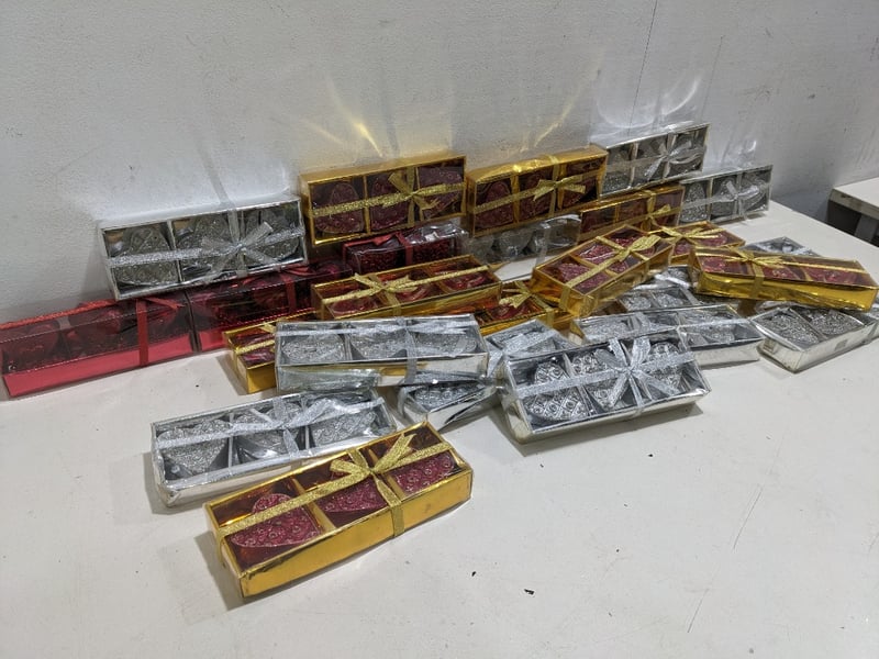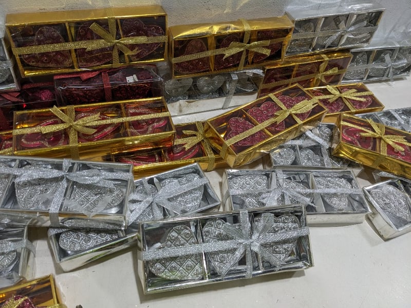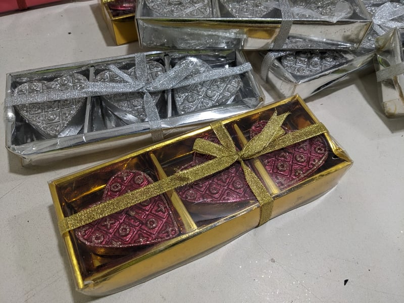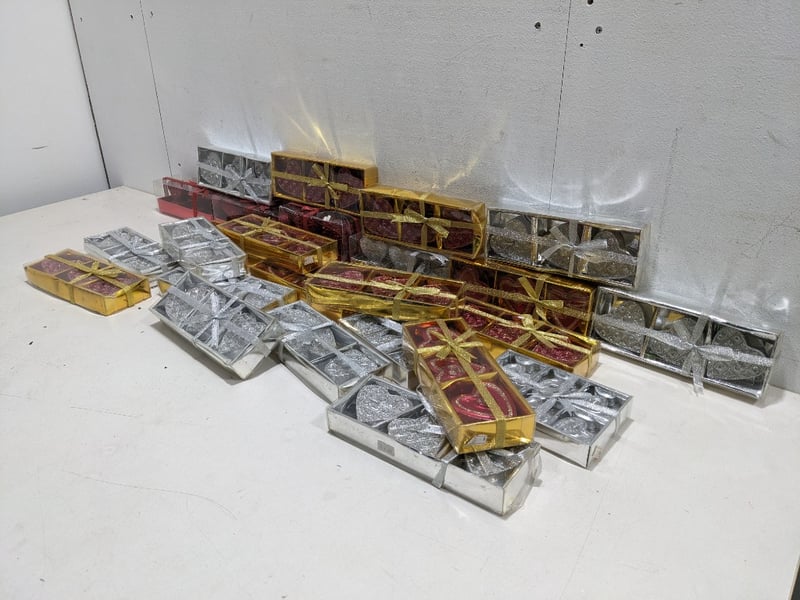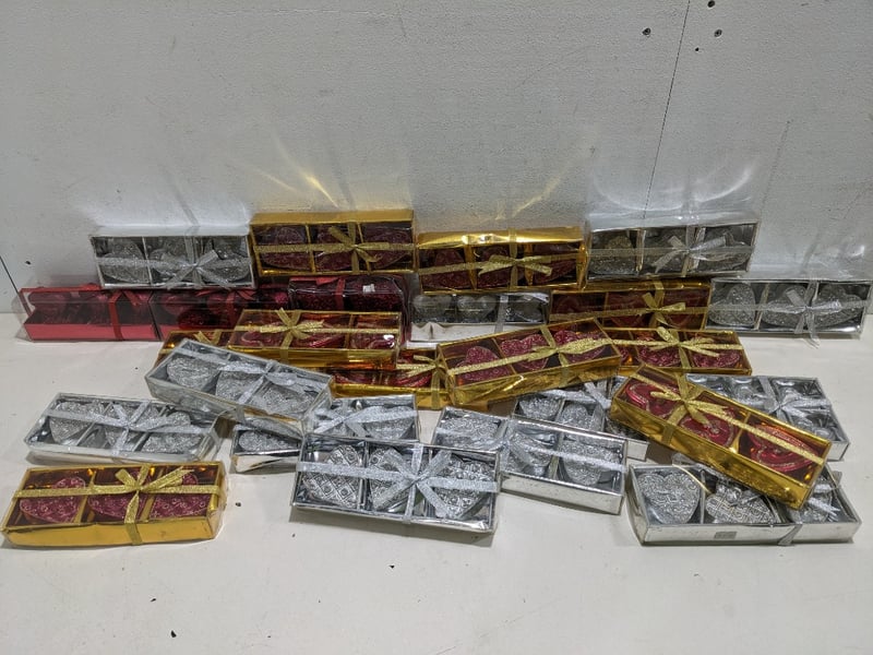 Assorted decorative heart-shaped candles, includes gold, silver and more..Sold as a lot.