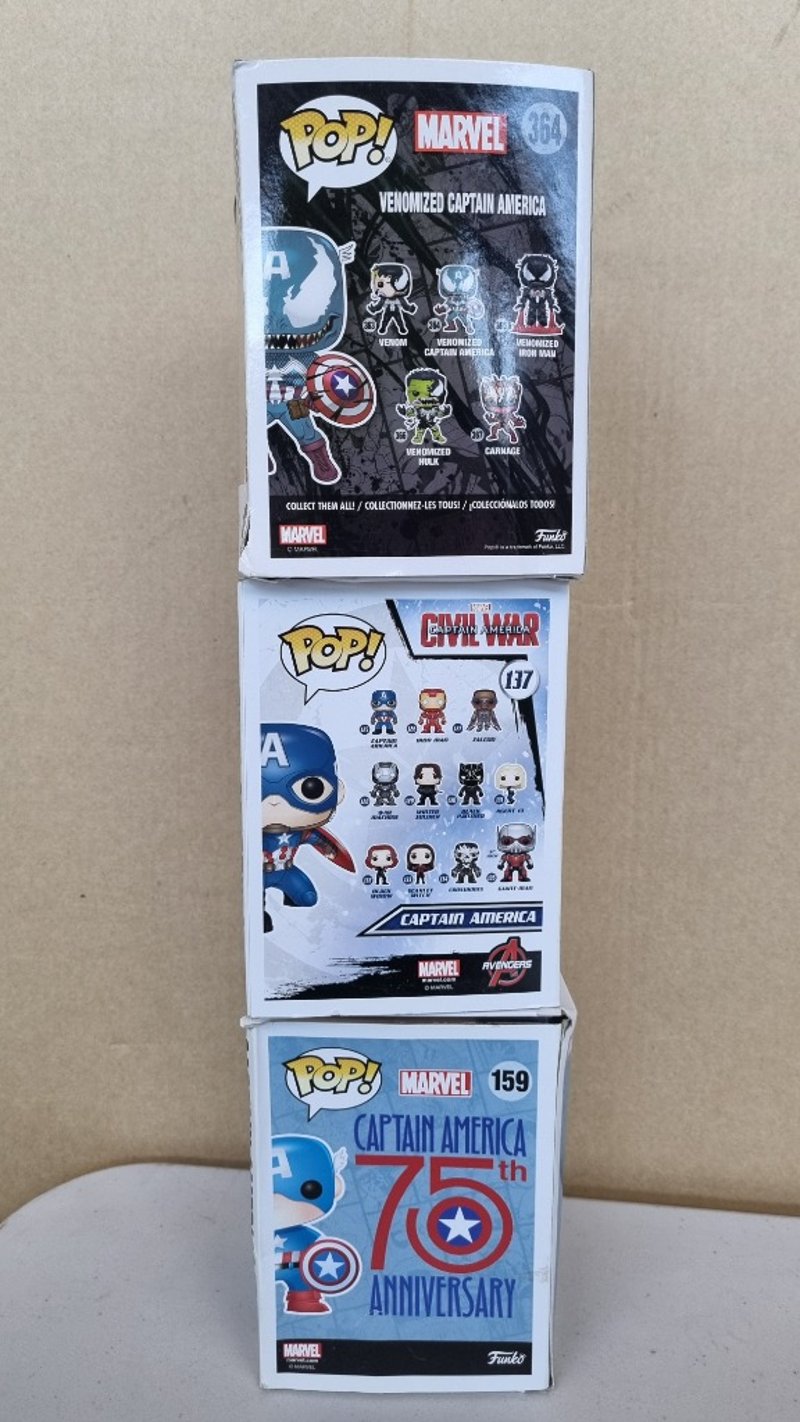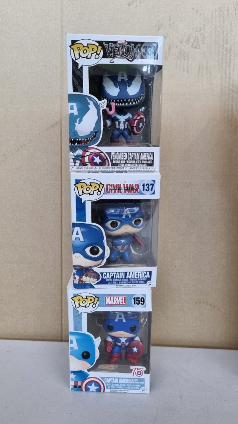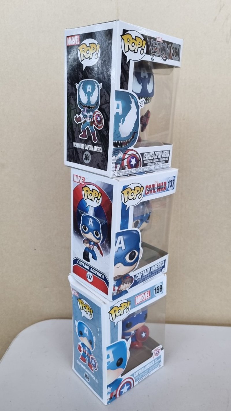 Funko Pop Vinyl Figures, Including three variants of Captain Ameica Sold as lot