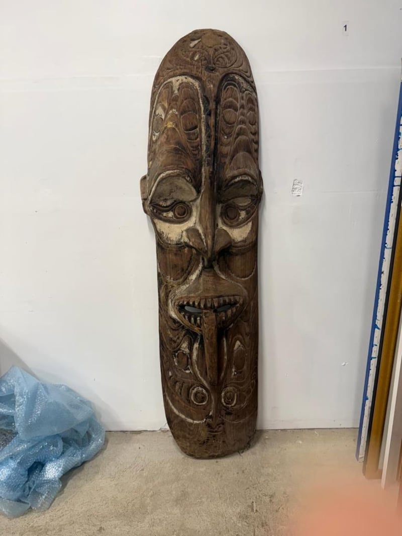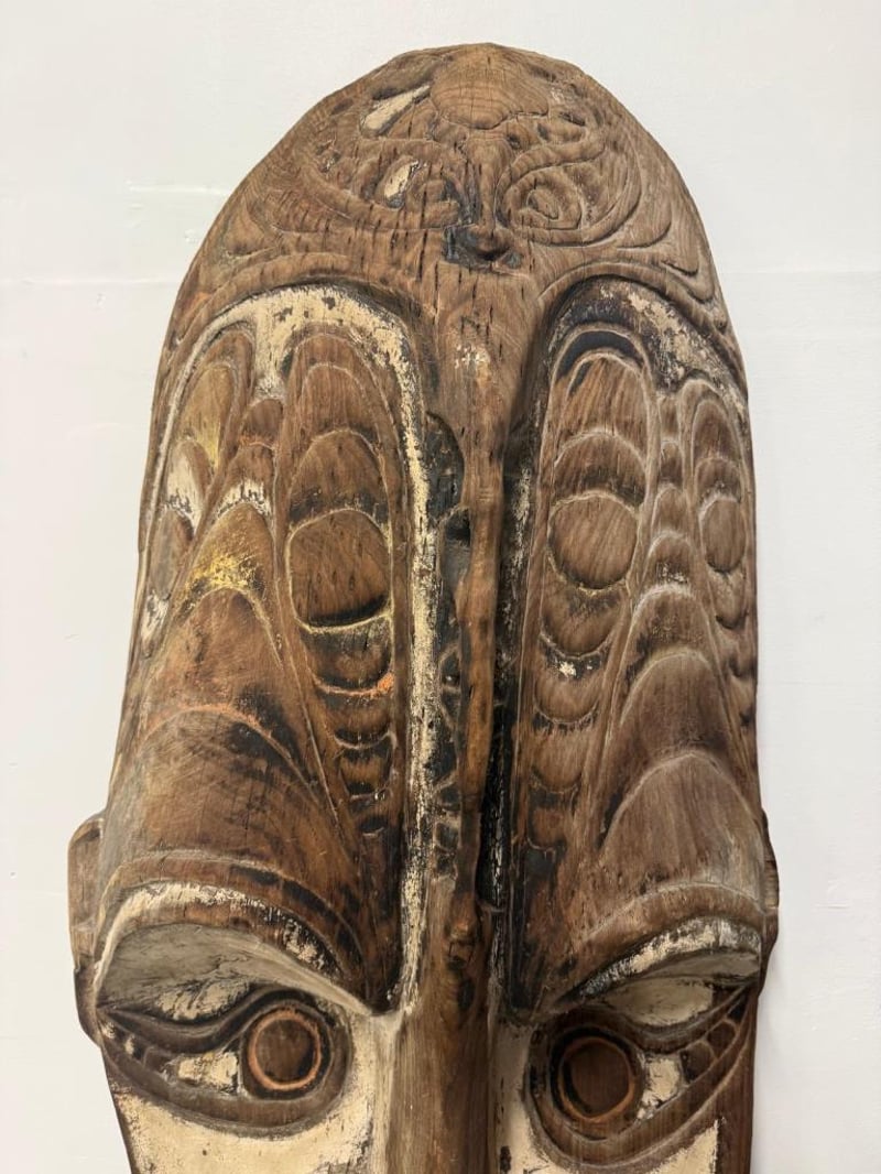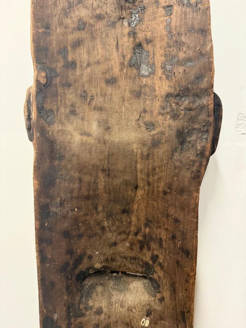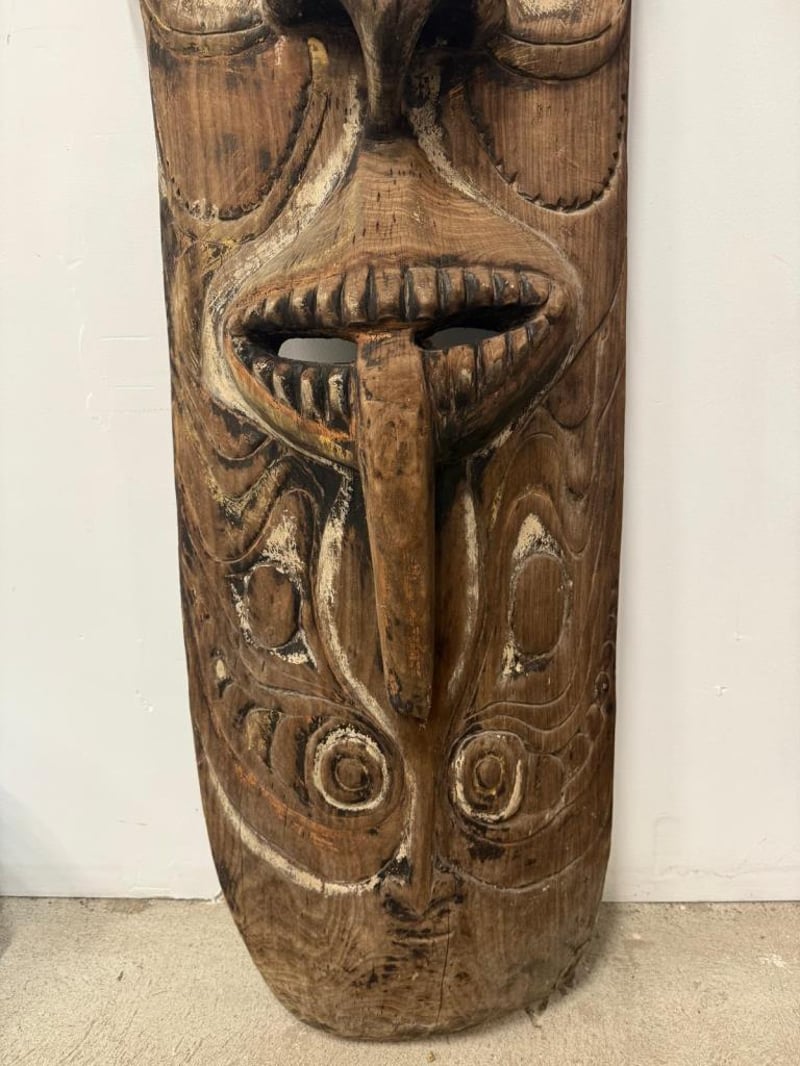 A striking hand-carved wooden spirit board (Gope) from Papua New Guinea, featuring a boldly stylised ancestral face with deep incised patterns, wide eyes, and a prominent tongue-like feature symbolising strength and spiritual communication. Traditionally created by the Gulf and Sepik River peoples, such boards were believed to embody protective ancestral spirits and were displayed in men’s ceremonial houses (haus tambaran) to safeguard the clan and ensure success in battle and daily life.