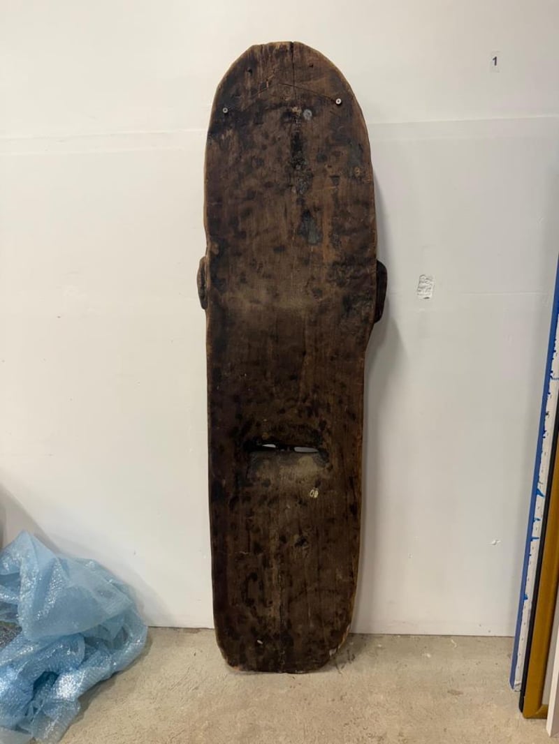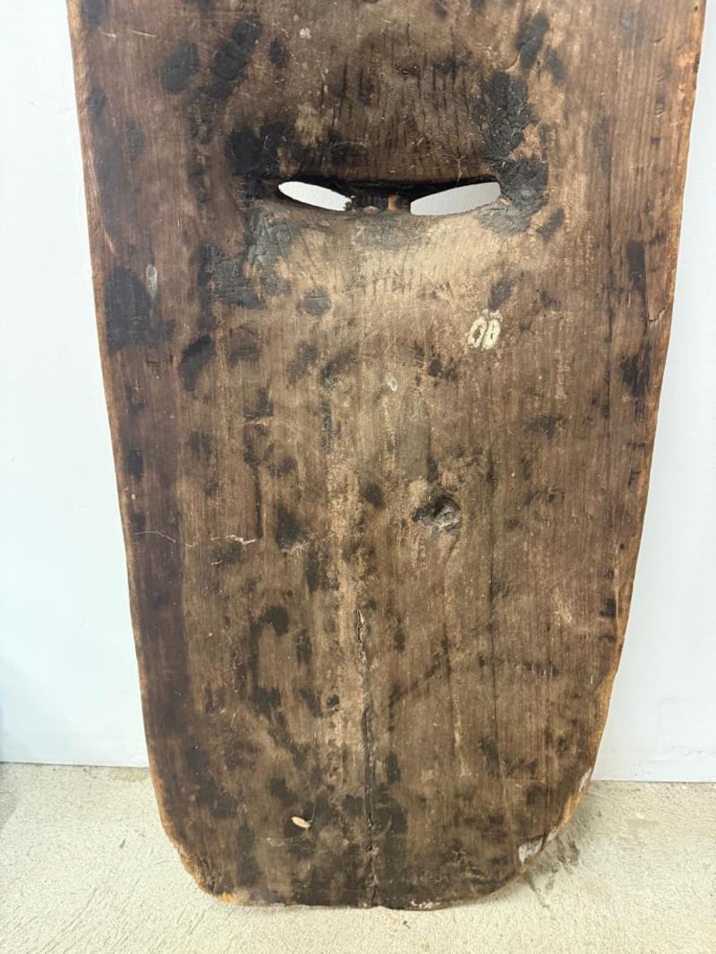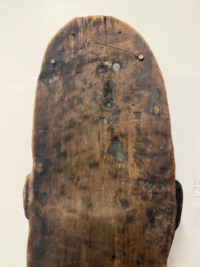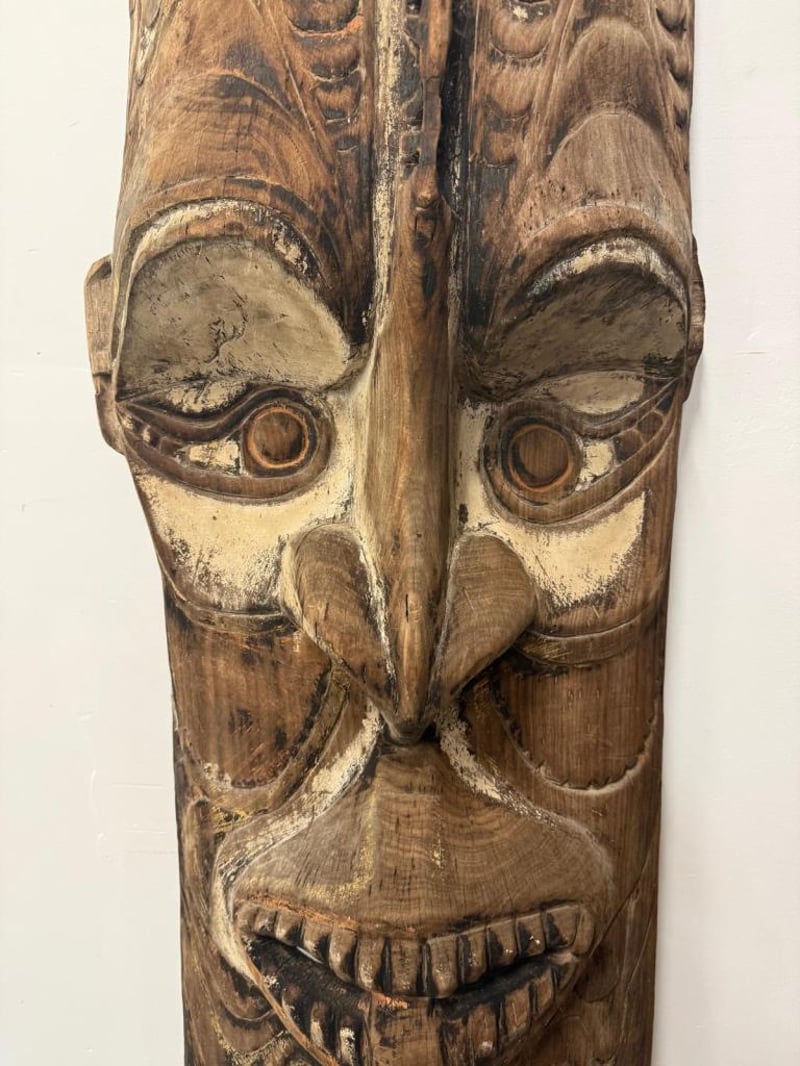 A striking hand-carved wooden spirit board (Gope) from Papua New Guinea, featuring a boldly stylised ancestral face with deep incised patterns, wide eyes, and a prominent tongue-like feature symbolising strength and spiritual communication. Traditionally created by the Gulf and Sepik River peoples, such boards were believed to embody protective ancestral spirits and were displayed in men’s ceremonial houses (haus tambaran) to safeguard the clan and ensure success in battle and daily life.