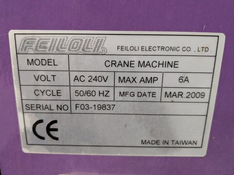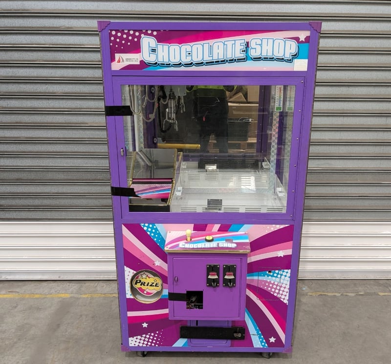 Arcade Claw Cran Machine, Chocolate Shop,Feiloli Electronic, unknown working Condition Model: Crane Machine Serial: F03-19837Dimensions: 100x88x187cm