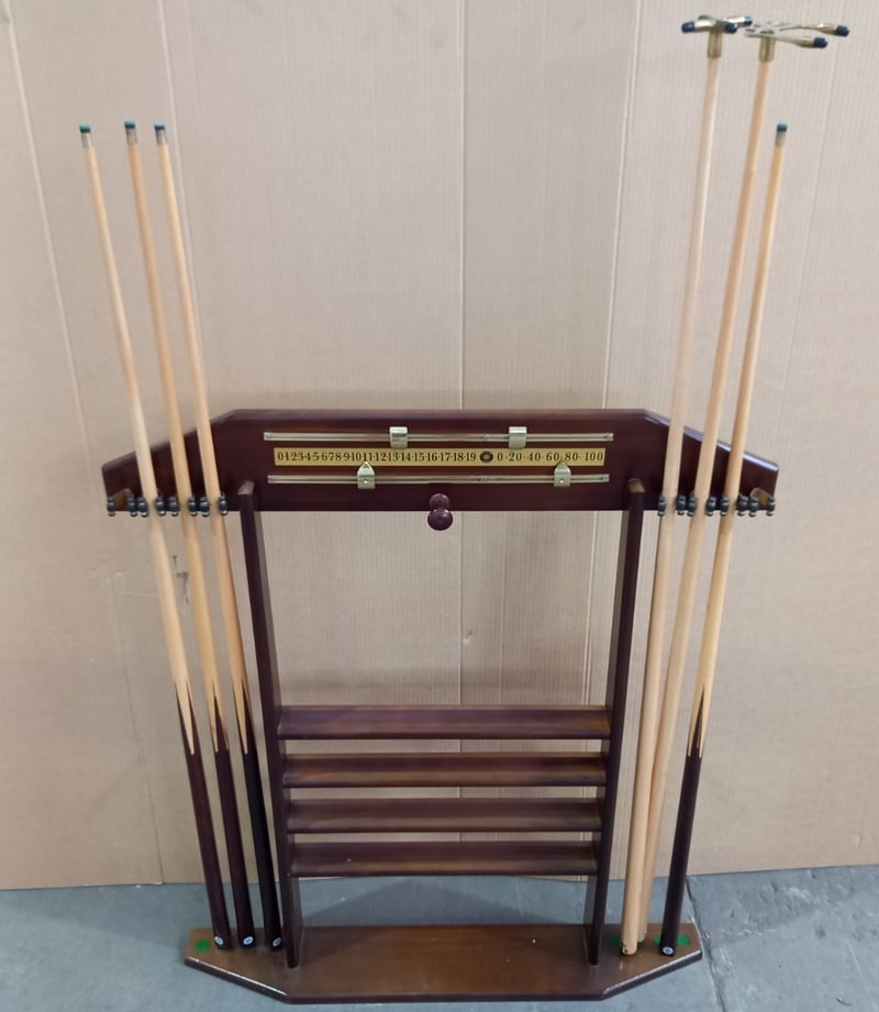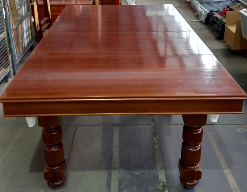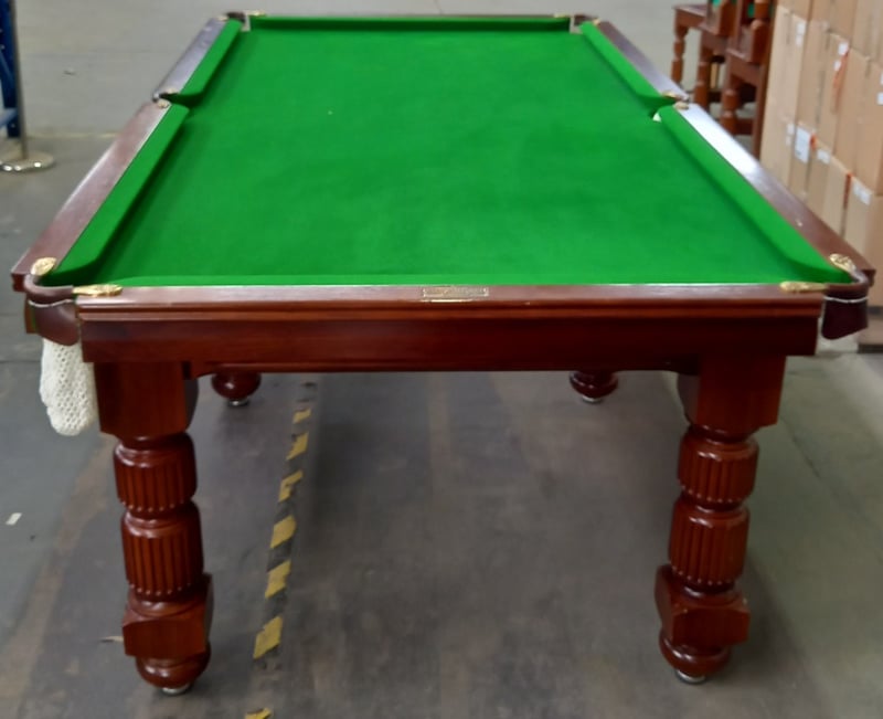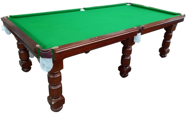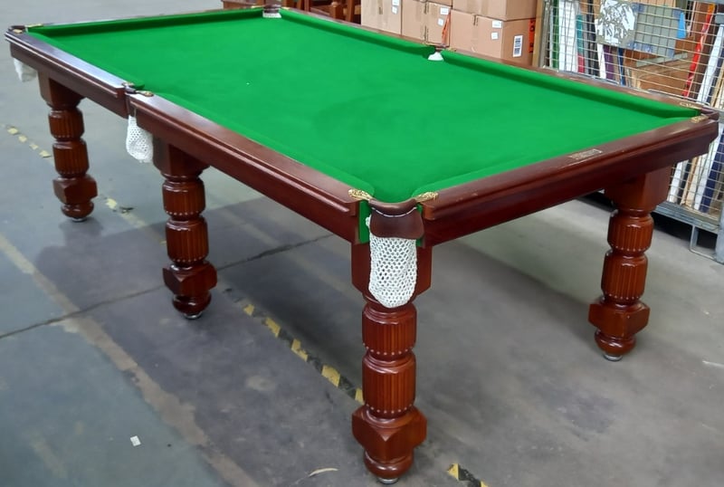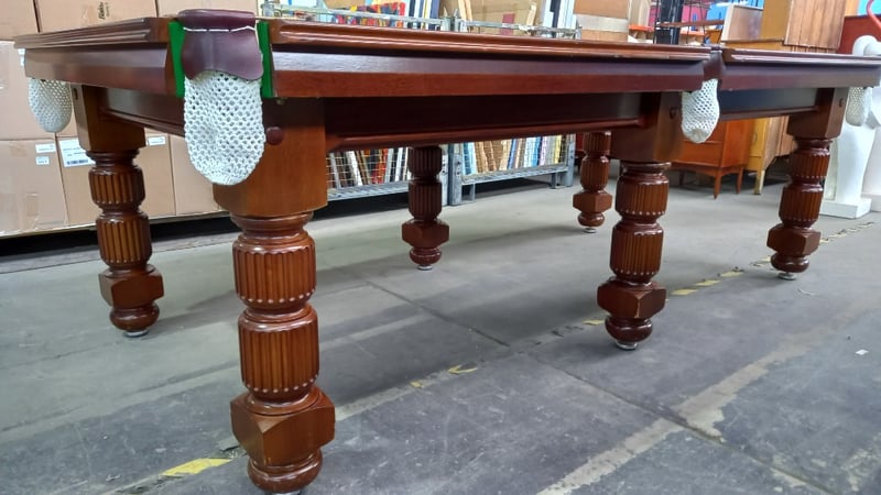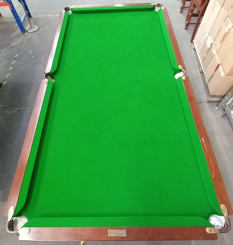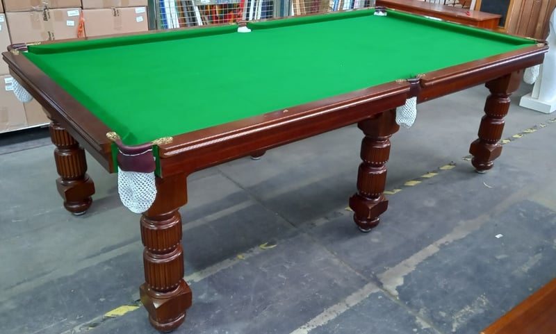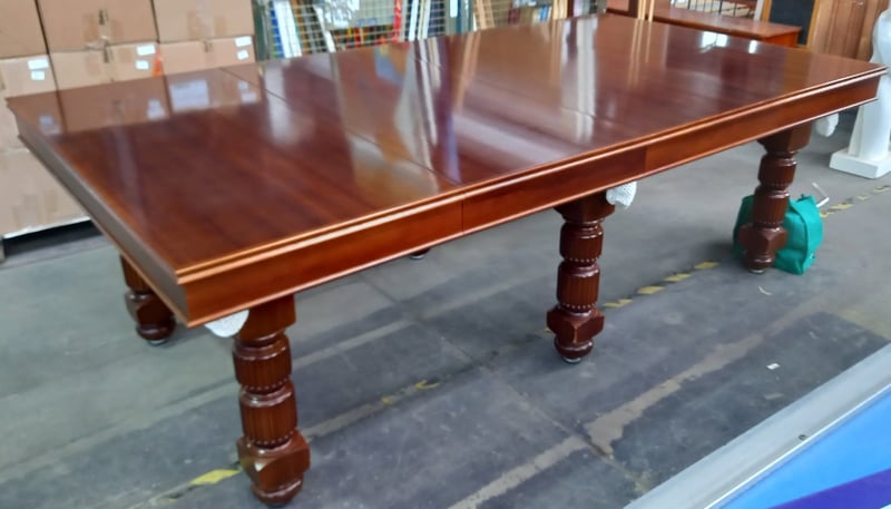8x4 ft slate base Billard table, PVC cover, 6 brass rings for table legs, complete set of snooker balls and kelly pool game balls with 4 cues, 1 jigger, 1 triangle, 1 spreader, scoreboard, 1 table brush, dice, dice shaker, and billiard chalk. Converts to dining table with 10 chairs, 4 piece wooden section table top.