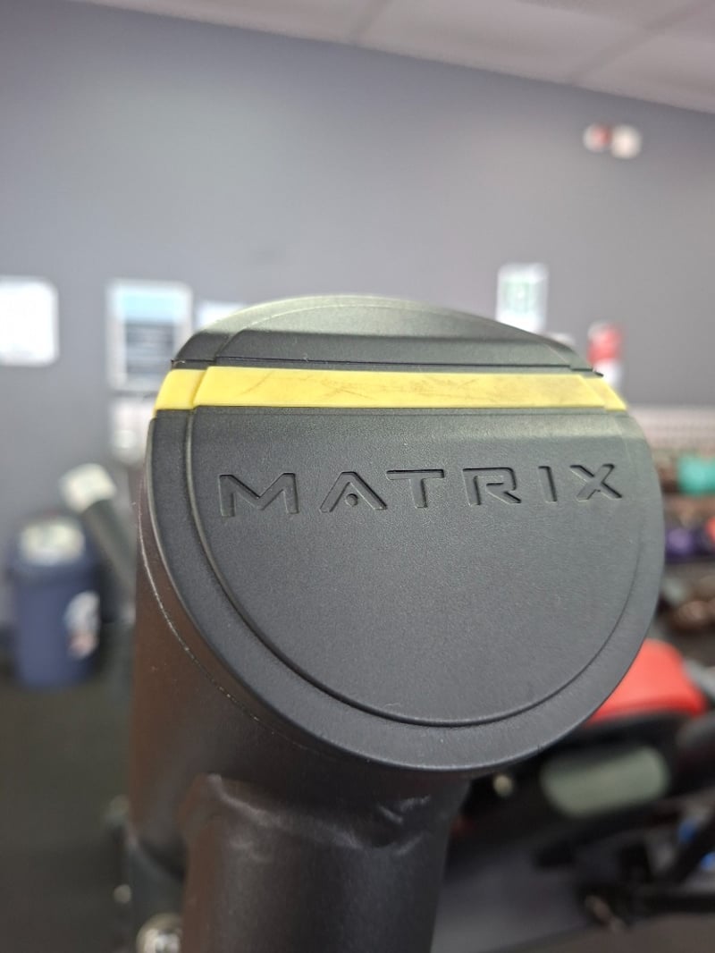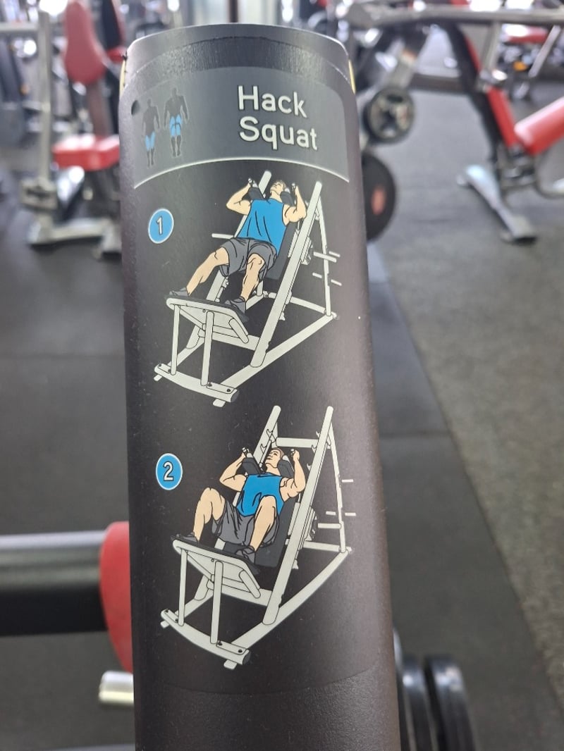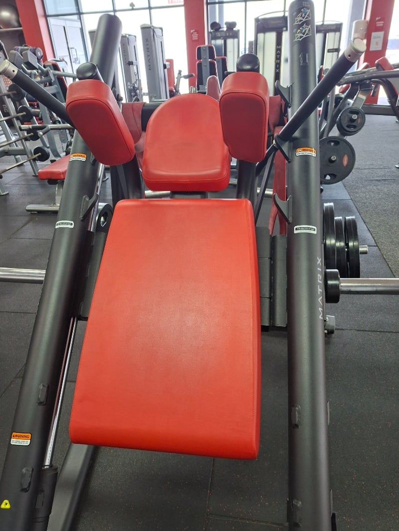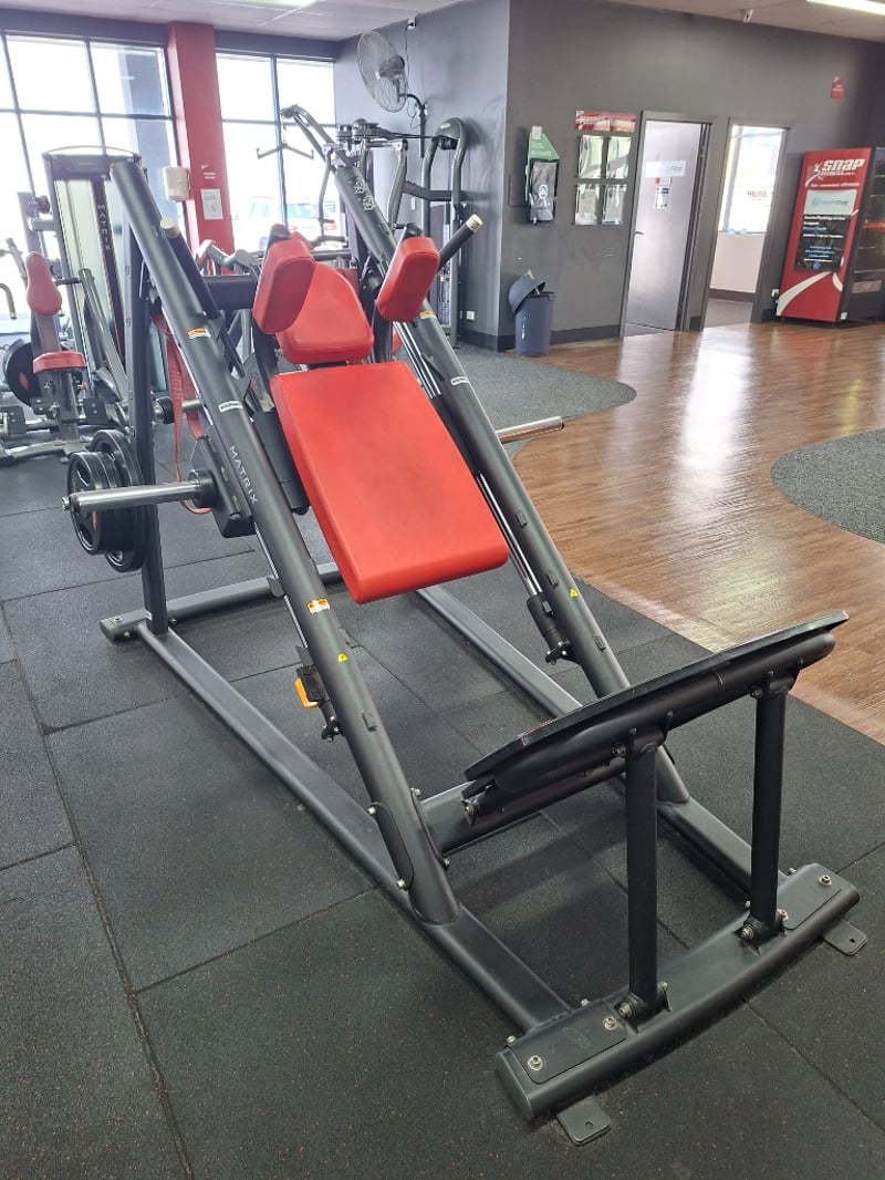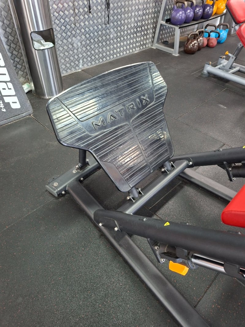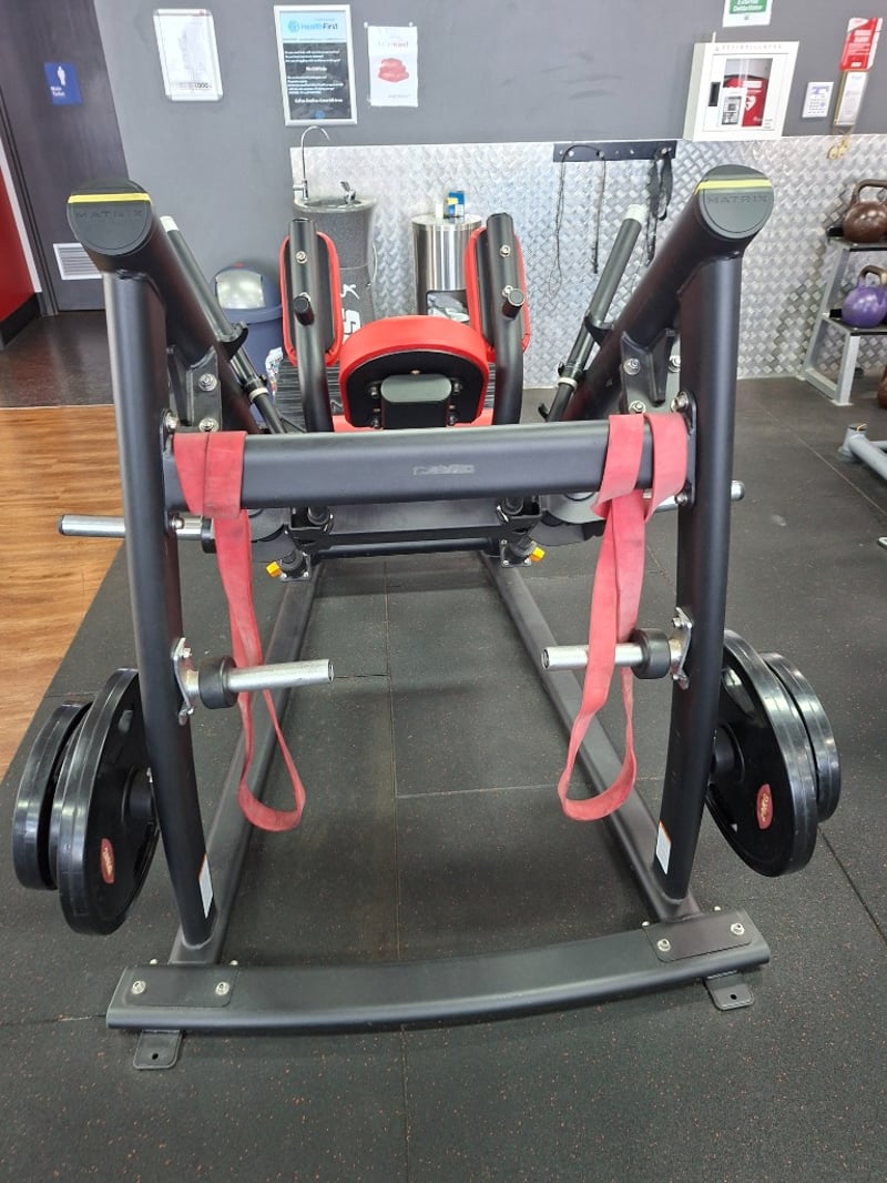 Hack Squat – Matrix Includes: 2 x 20kg weight plates 4 x 10kg weight plates 1 x resistance band Description: Matrix commercial-grade hack squat machine, designed for lower body strength training. Heavy-duty steel frame construction with adjustable footplate and safety handles for controlled movement.