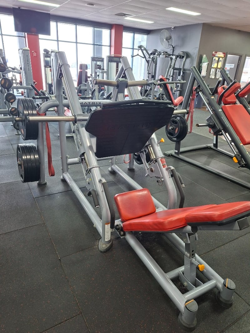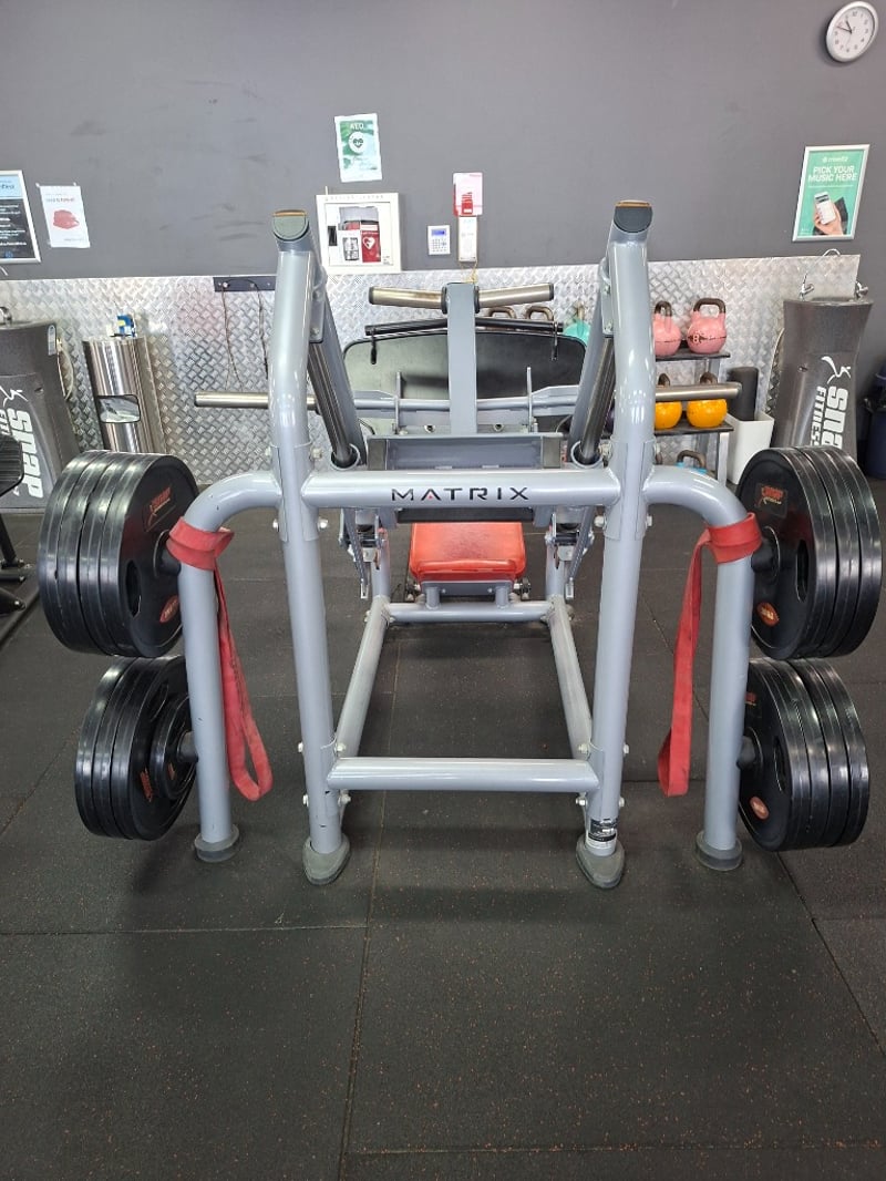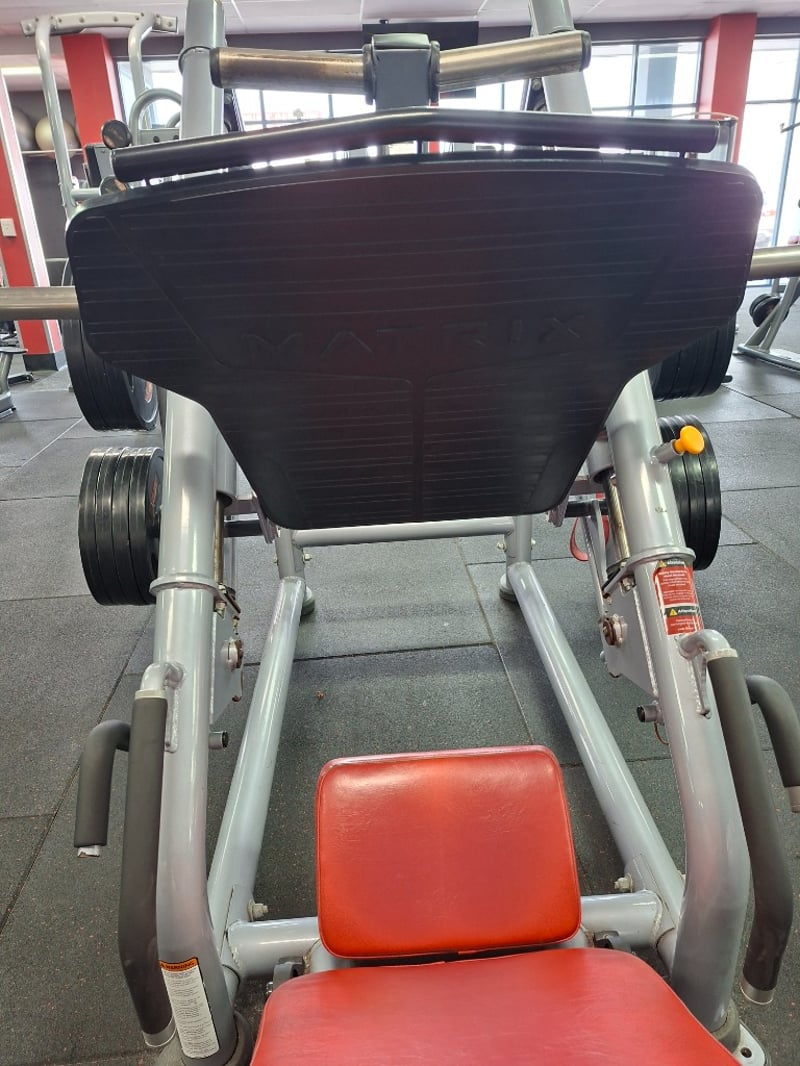 Leg Press – Matrix Includes: 14 x 20kg weight plates 1 x 5kg weight plate 2 x resistance bands Description: Matrix commercial-grade leg press machine, built for heavy-duty lower body workouts. Features a robust steel frame, smooth glide track system, and adjustable seat positioning for optimal comfort and performance.