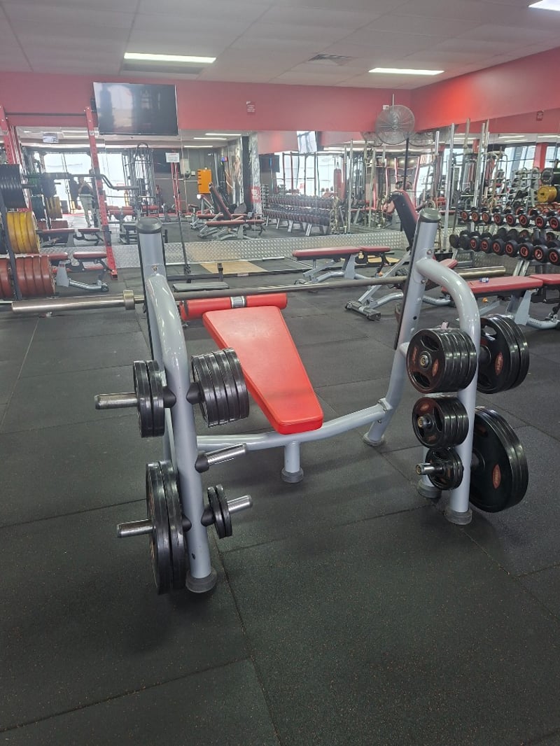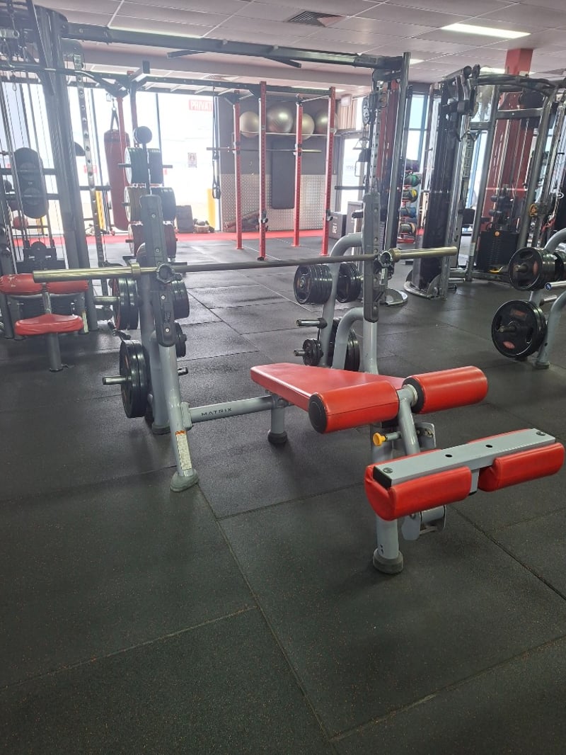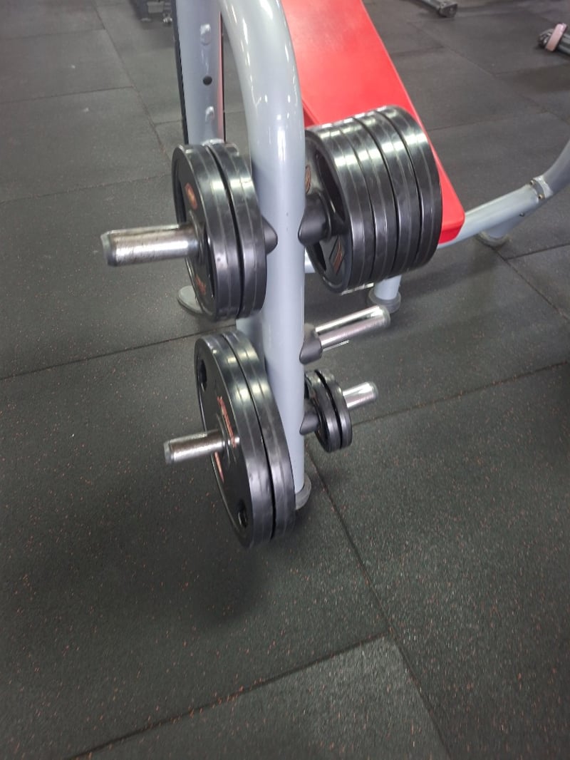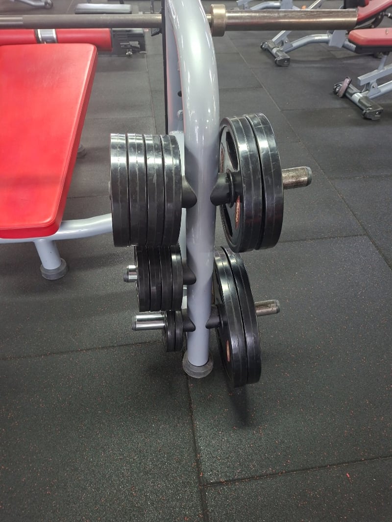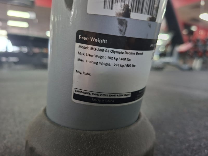 Decline Bench Press – Matrix Includes: 1 x 20kg barbell 4 x 20kg weight plates 2 x 10kg weight plates 10 x 5kg weight plates 4 x 2.5kg weight plates 4 x 1.25kg weight plates Description: Matrix commercial-grade decline bench press designed for lower chest and triceps development. Built with a solid steel frame, ergonomic decline angle, and integrated racking points. Complete with 20kg barbell and a full range of weight plates for versatile strength training. Model: MG-A80-03