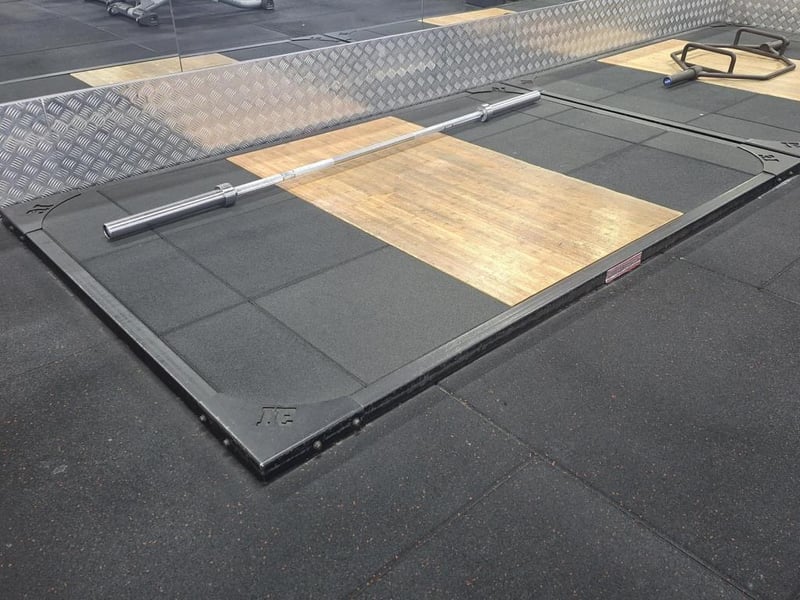 Iron Edge commercial-grade deadlift platform designed for Olympic and powerlifting training. Features a durable timber and rubber surface to protect flooring and equipment during heavy lifts. Paired with an Aussie Strength 20kg barbell, this setup provides a solid and professional base for strength training and deadlift work.