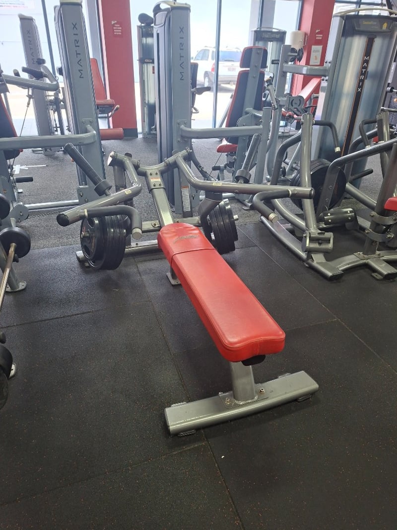 Commercial-grade plate-loaded Subline bench designed for chest and upper body workouts. Features a durable steel frame with ergonomic seat and backrest positioning for stability and comfort during pressing exercises.