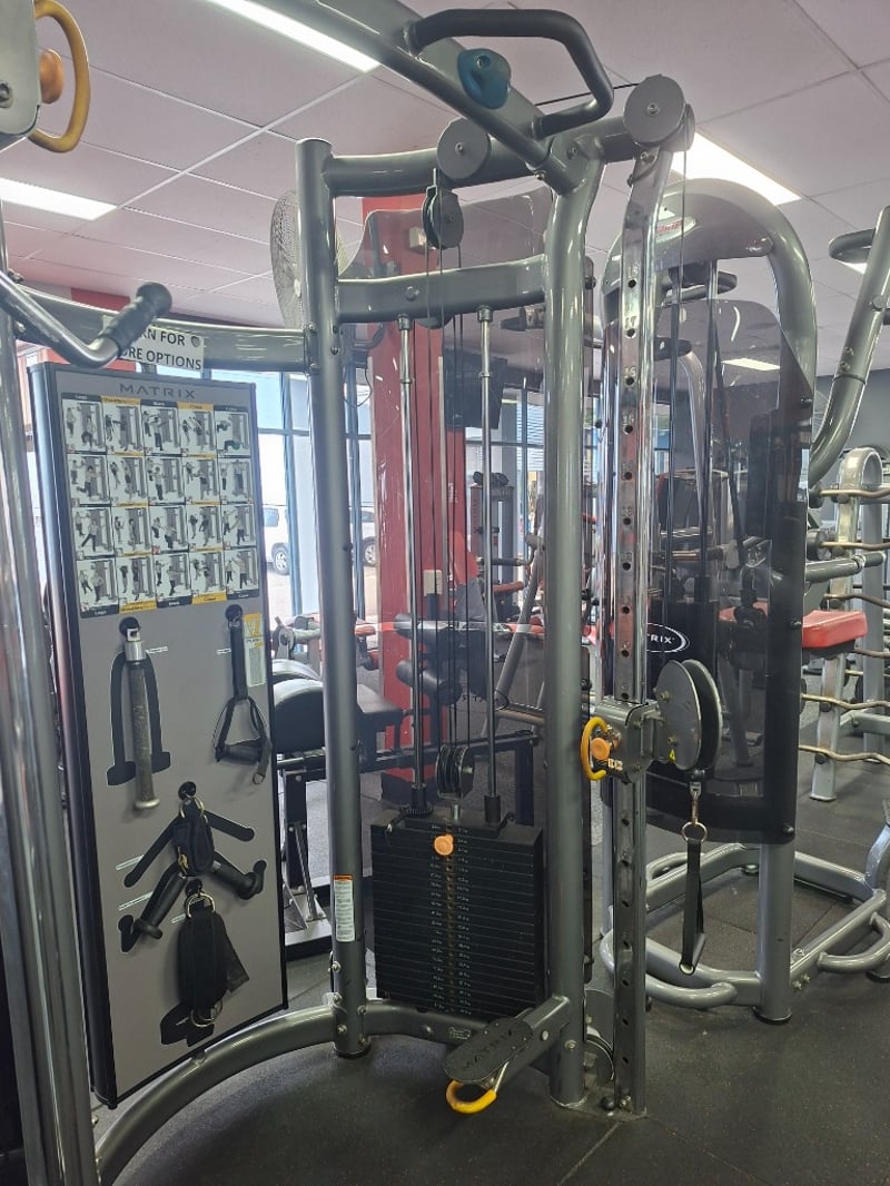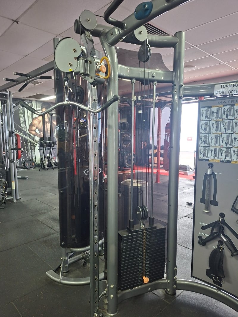 Matrix dual adjustable pulley cable crossover machine, designed for a full-body functional strength workout. Features dual 95kg weight stacks with independent pulleys, height-adjustable cable columns, and integrated exercise guide panel for training versatility.