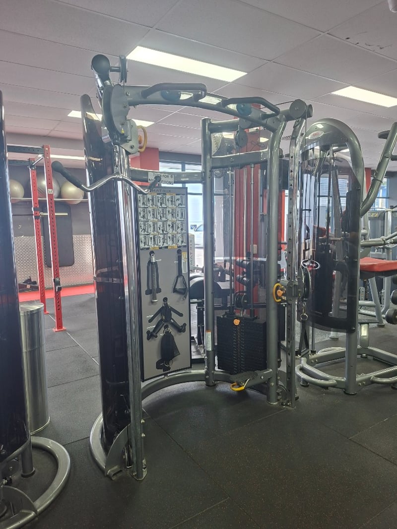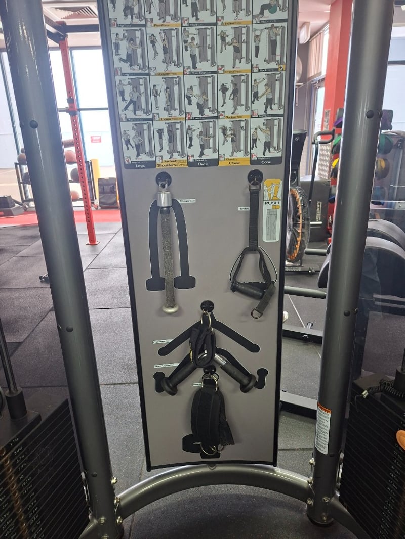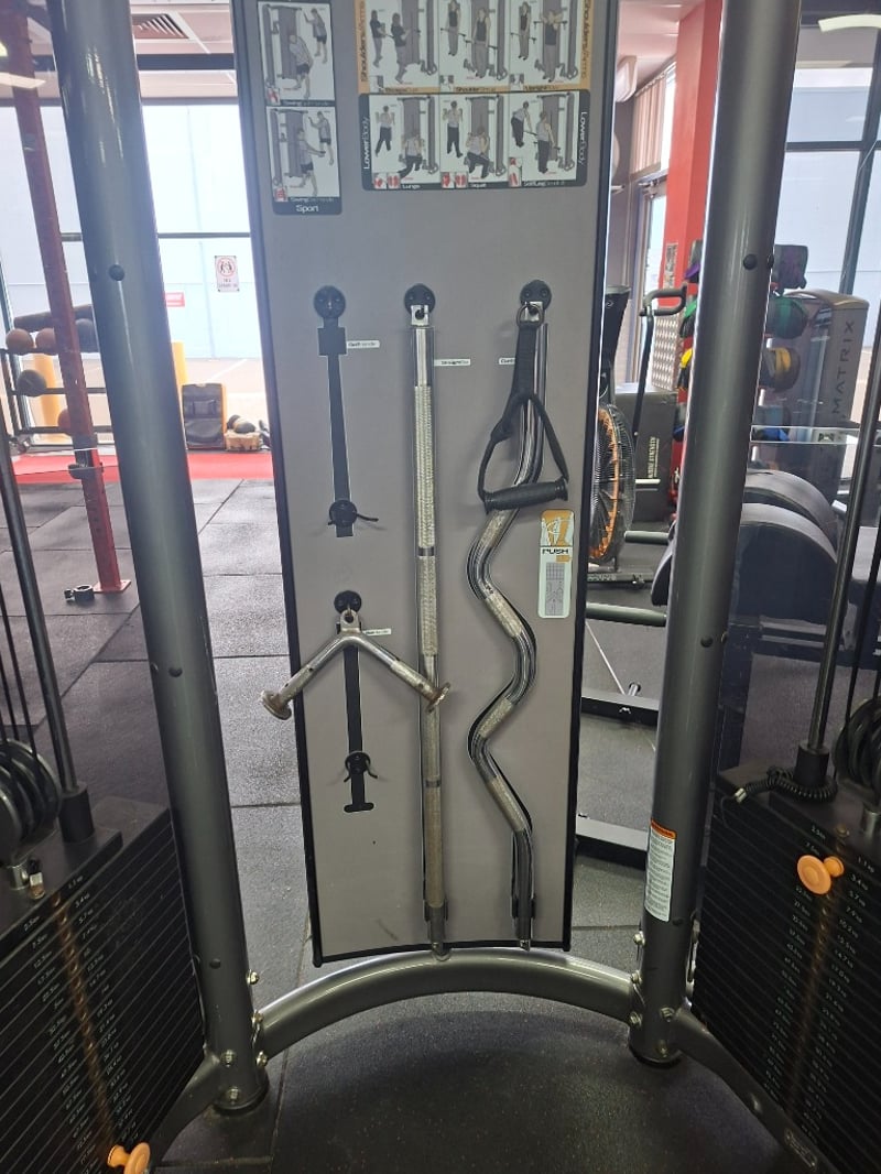 11 x cable attachments including straight bar, EZ curl bar, rope, single handles, tricep bar, ankle strap, and dual grip attachments