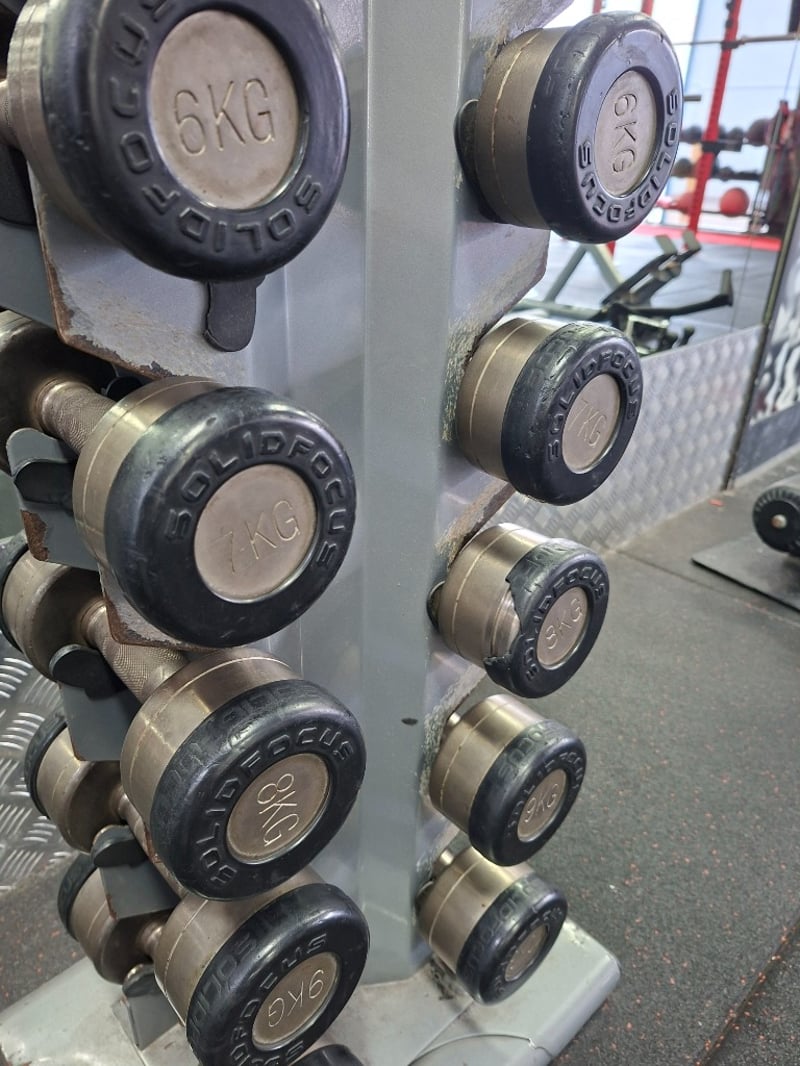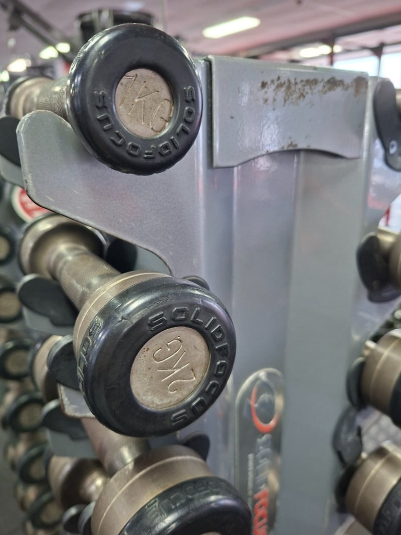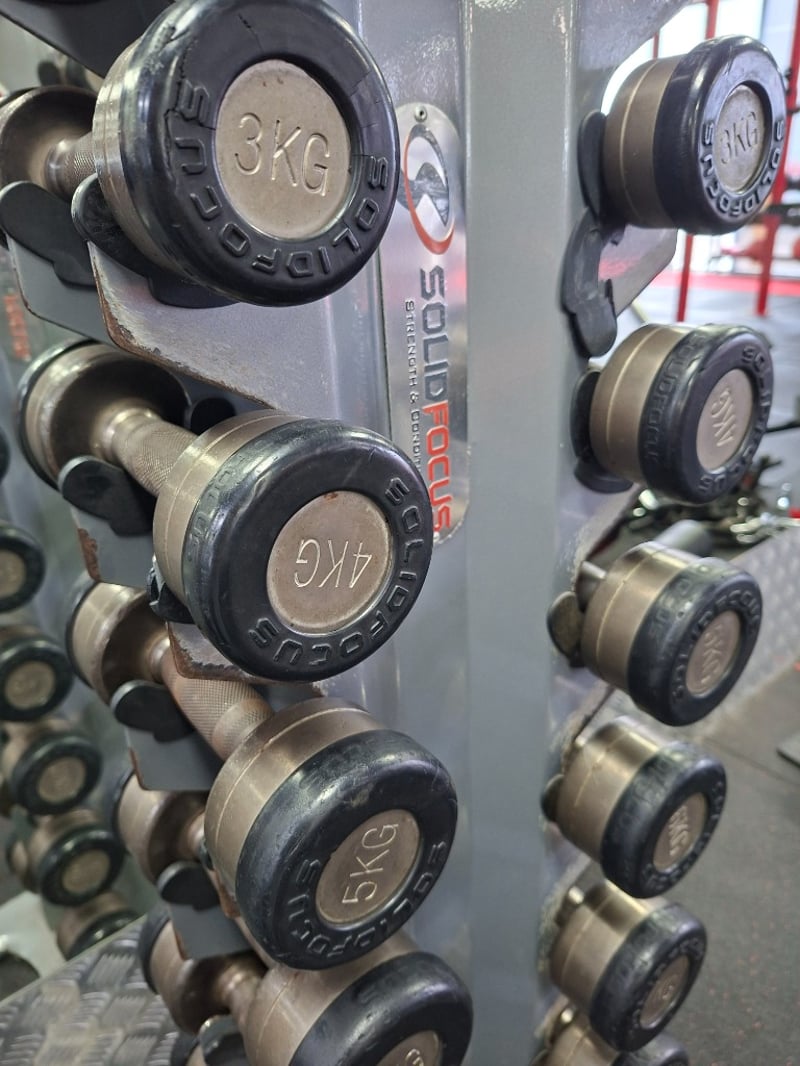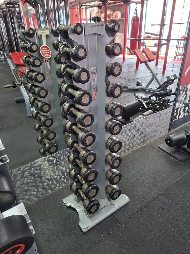 Solid Focus Dumbbell Tower – Complete Set Includes Dumbbells: 1kg, 2kg, 3kg, 4kg, 5kg, 6kg, 7kg, 8kg, 9kg, 10kg (pairs as pictured) Description: Commercial Solid Focus dumbbell tower with full light-to-midweight dumbbell set. Stainless steel handles, rubber-coated heads, and a compact, space-saving vertical rack.