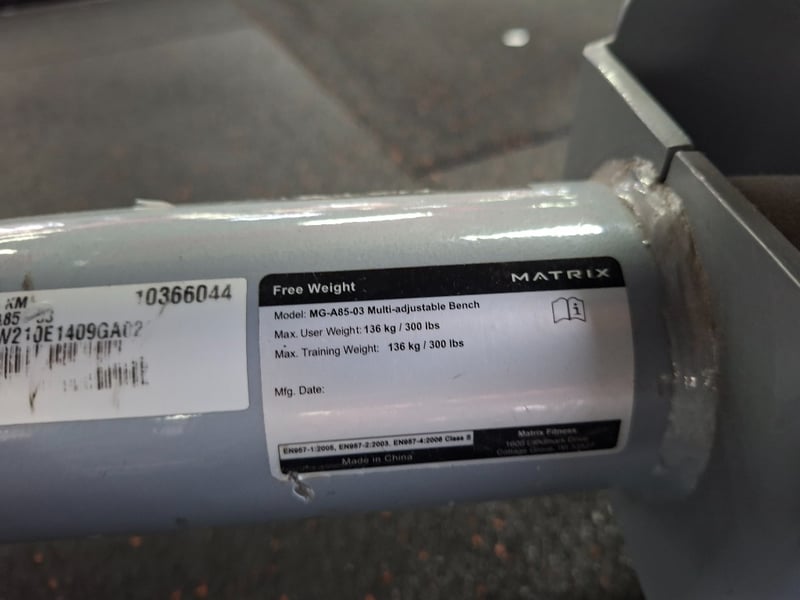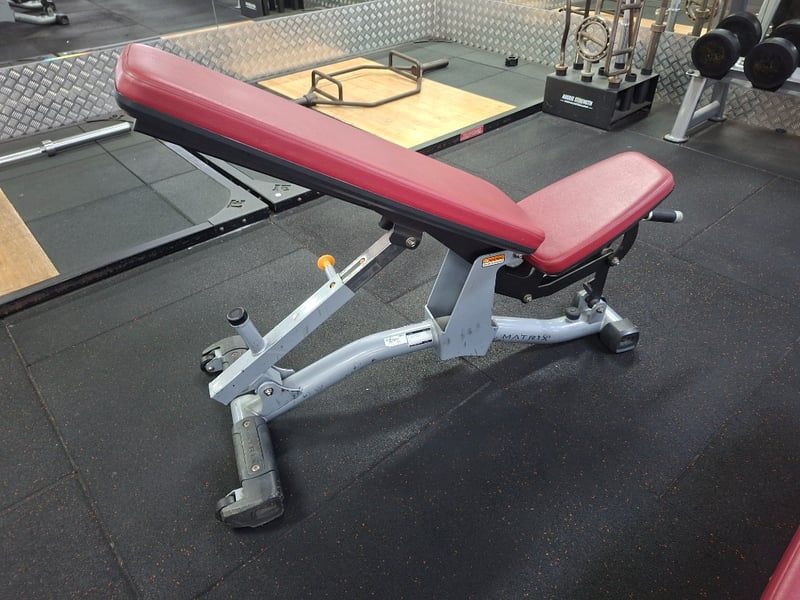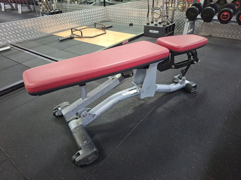 Commercial-grade Matrix free-weight adjustable bench, designed for flat, incline, and upright training positions. Heavy-duty steel frame with transport wheels and handle for easy movement. Features durable red upholstery and multiple backrest/seat adjustment points for versatile strength training.
