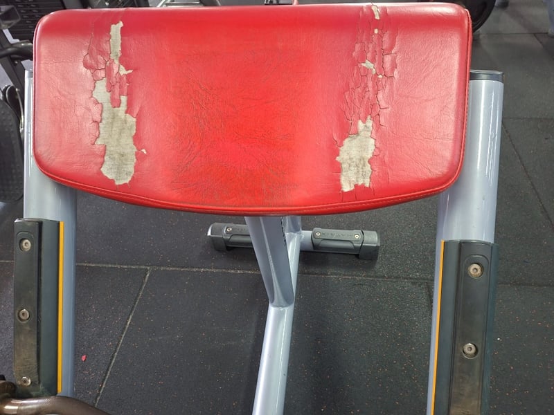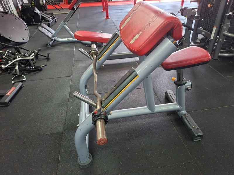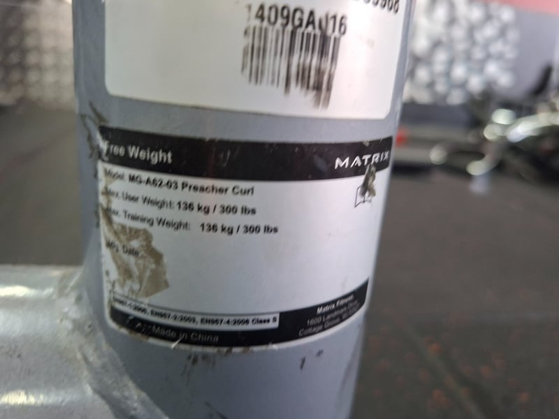 Matrix Preacher Curl Bench With Curl Bar Description: Commercial Matrix preacher curl bench, designed for isolated bicep training. Features an angled arm pad for strict curl positioning and an adjustable seat for proper user alignment. Includes a curl bar as shown. Heavy-duty steel frame with wide foot base for stability.
