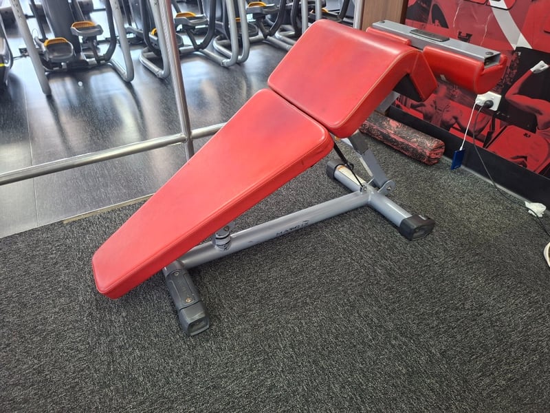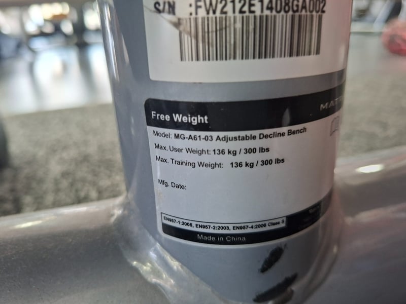 Matrix Adjustable Decline Bench Model: MG-A61-03 Adjustable Decline Bench Description: Commercial-grade Matrix adjustable decline bench, built for durability and heavy training environments. Features a sturdy steel frame, padded decline bench surface, and adjustable positioning for a range of decline exercises.