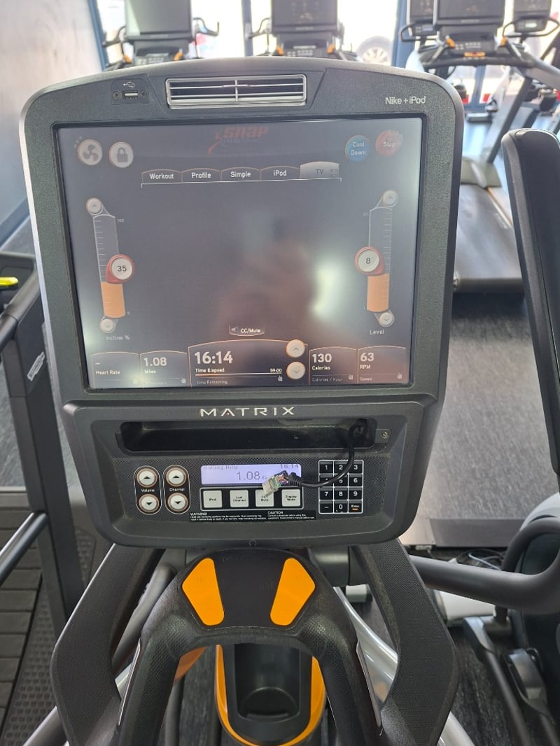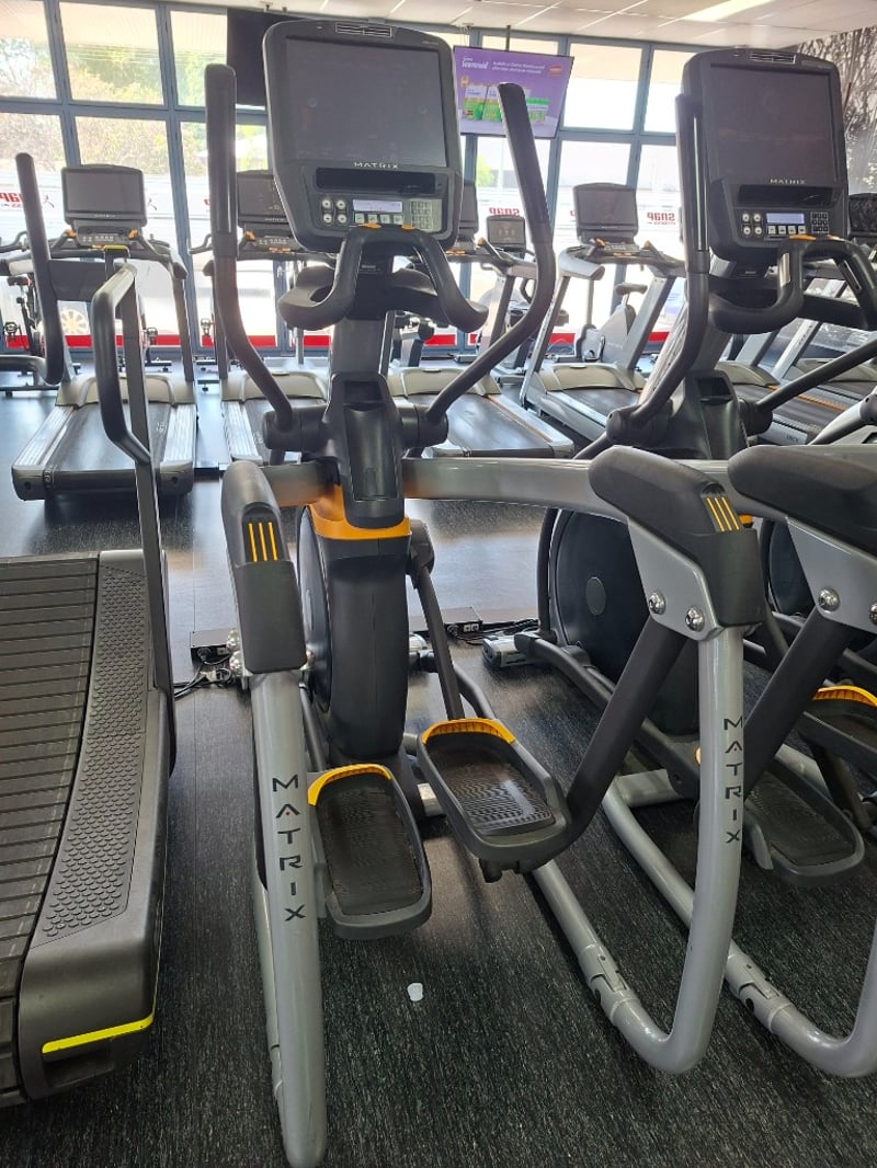 Commercial-grade Matrix elliptical trainer designed for smooth, low-impact cardio workouts. Features ergonomic multi-grip handles, oversized cushioned pedals, and an intuitive console for tracking key workout metrics.