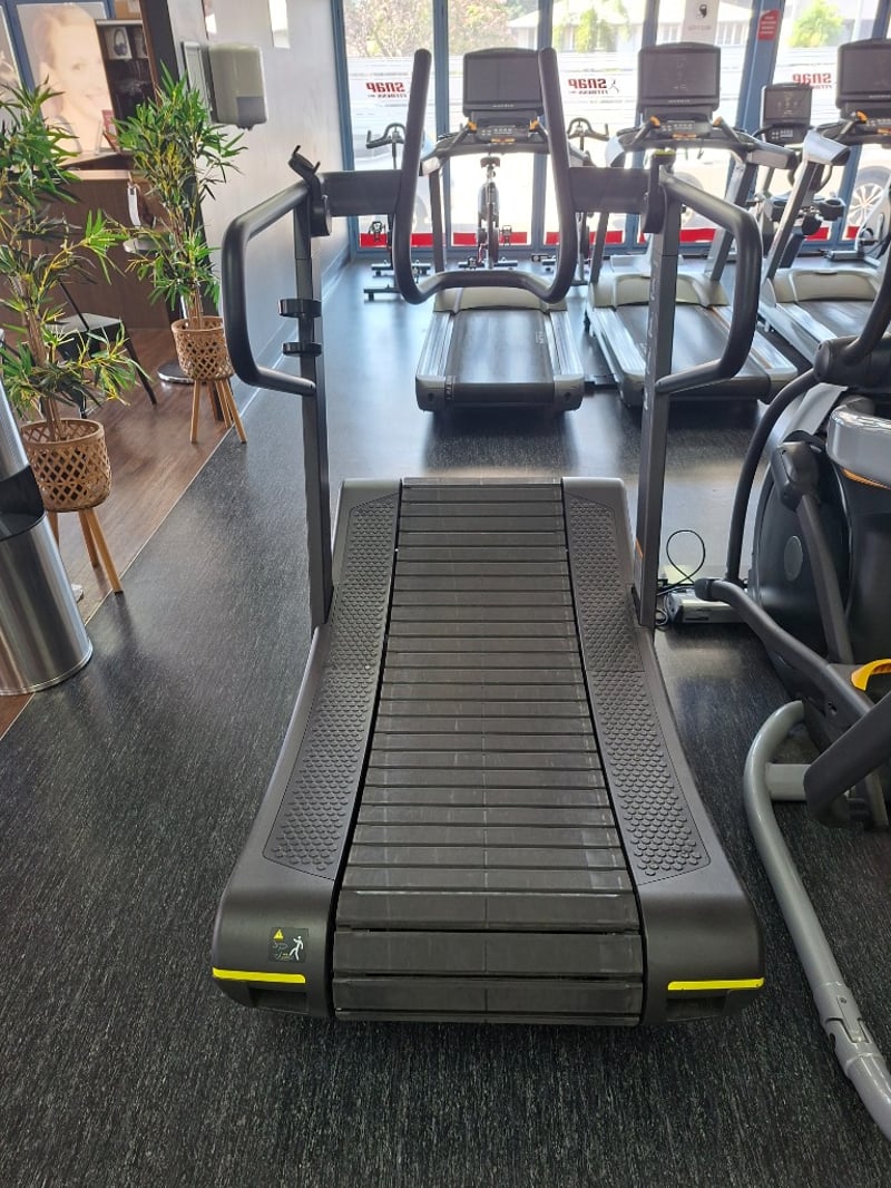 Skillmill – Technogym Non-Motorised Curved Treadmill Description: Technogym Skillmill non-motorised curved treadmill, designed for high-intensity cardio, speed, power and resistance training. Self-powered system with multi-grip handles, adjustable resistance dial, and durable commercial-grade frame