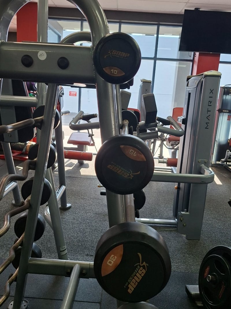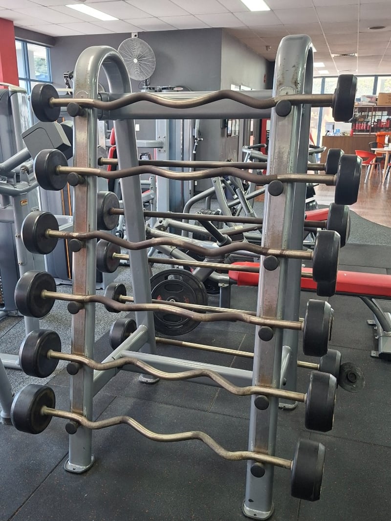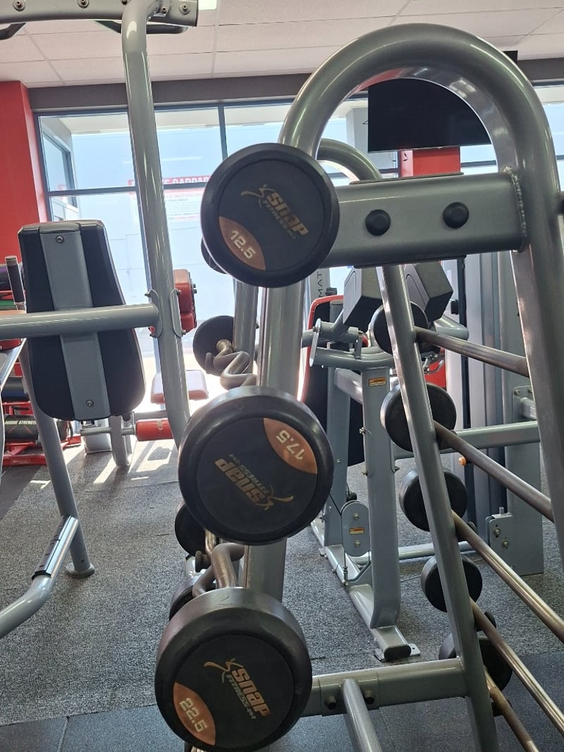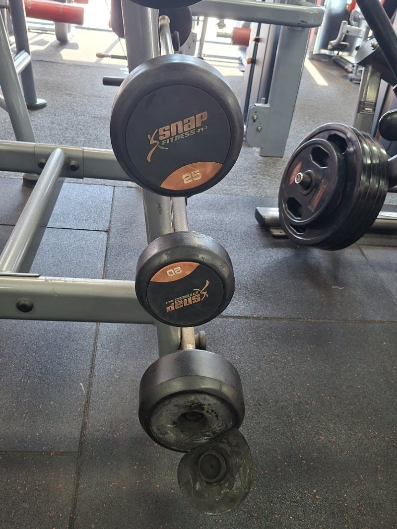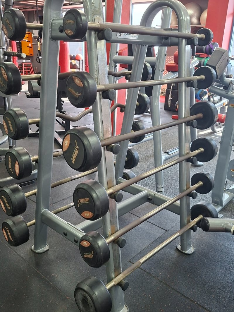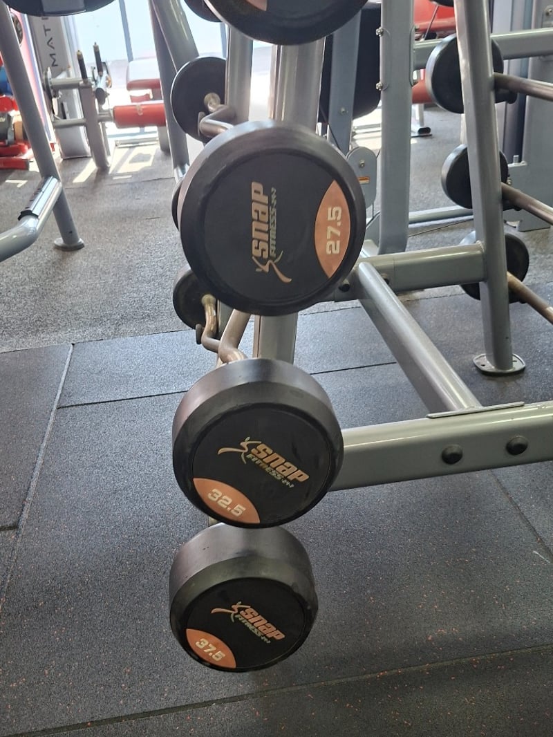 Fixed Barbell Set with Storage Rack Description: Complete set of fixed barbells with matching vertical storage rack. Snap Fitness branded rubber-coated barbell heads with steel handles. Ideal for commercial gyms, studios, PT facilities or home training setups. Includes various weights as pictured. Includes Barbell Weights: 10 kg 12.5 kg 17.5 kg 20 kg 22.5 kg 25 kg 27.5 kg 30 kg 32.5 kg 37.5 kg (note: one end cap damaged as shown) Bid is for the full set + rack.