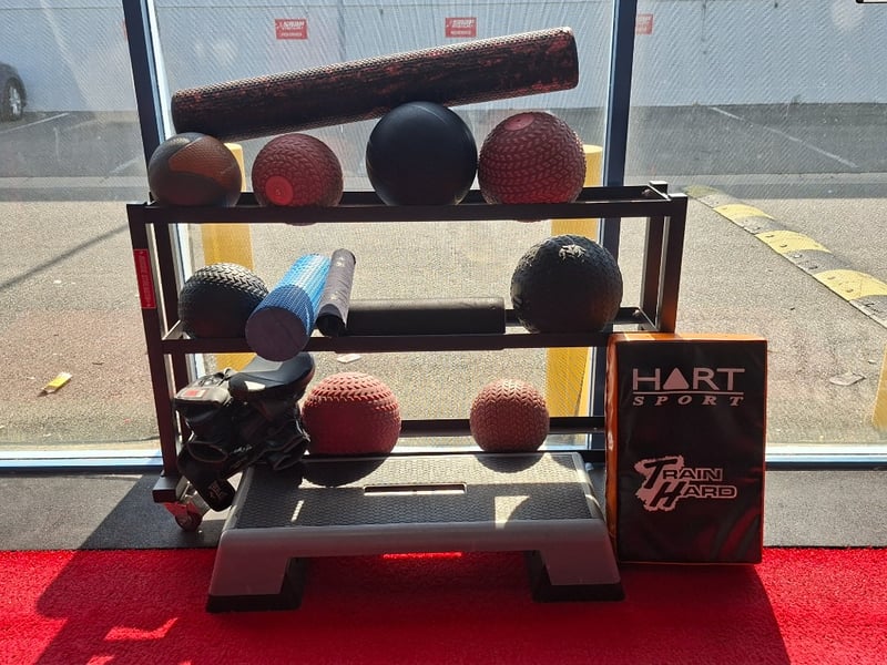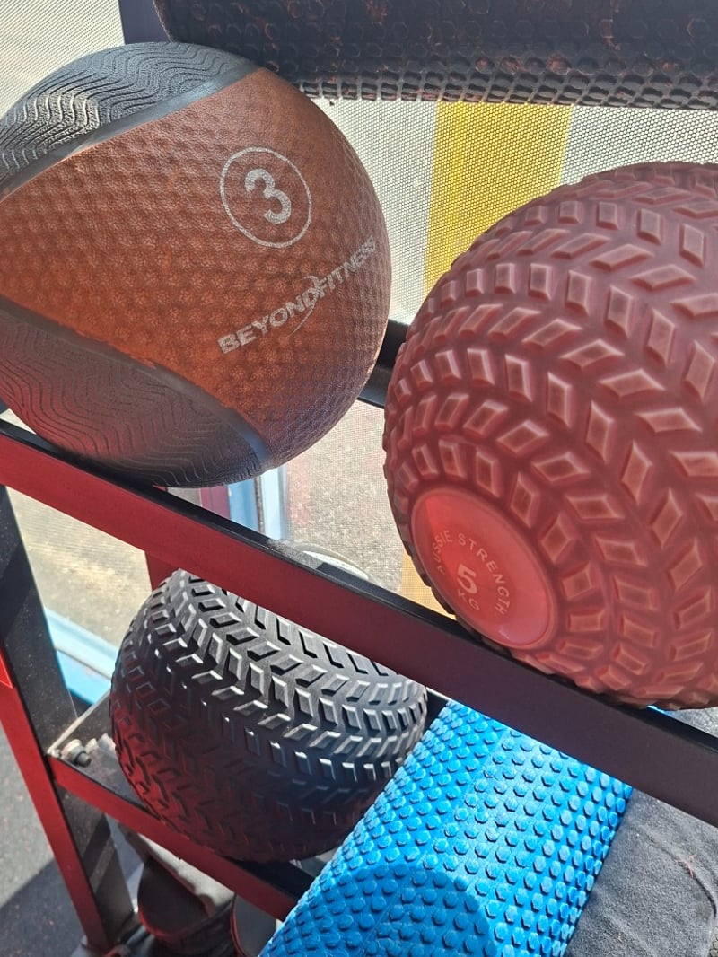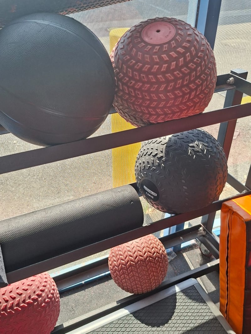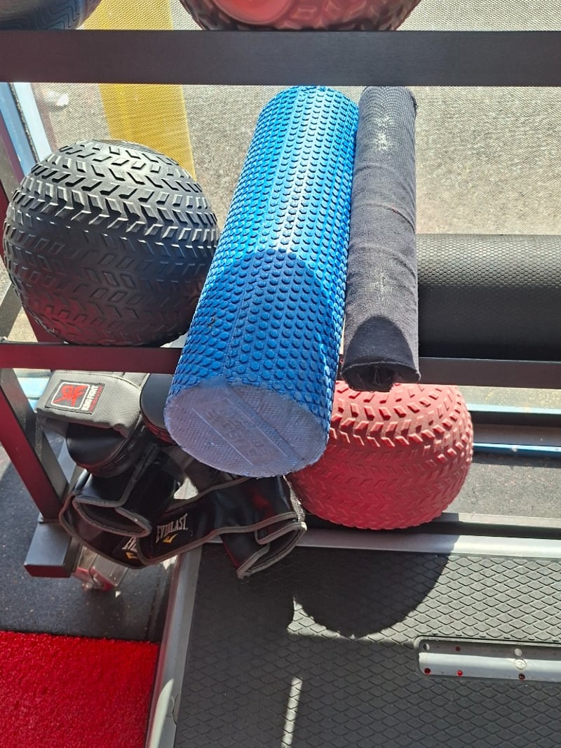 Assorted lot of Gym Accessories including Medicine Balls, Rack, Boxing Gloves, Boxing Pad, Foam Rollers and More SOLD AS LOT