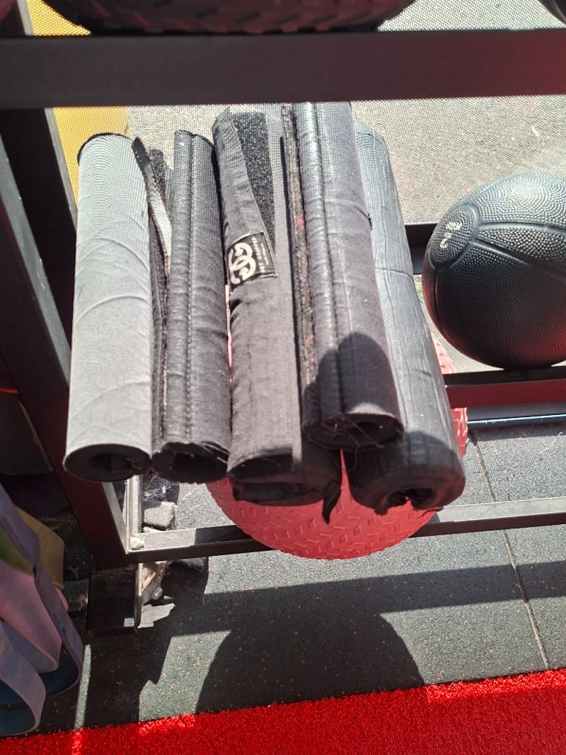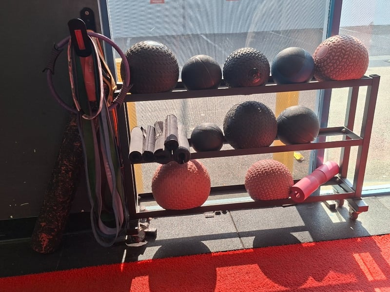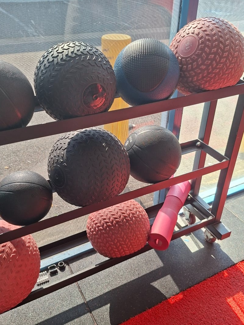 Assorted lot of Gym Accessories including Medicine Balls, Rack, Resistance Band, Foam Rollers and more SOLD AS LOT