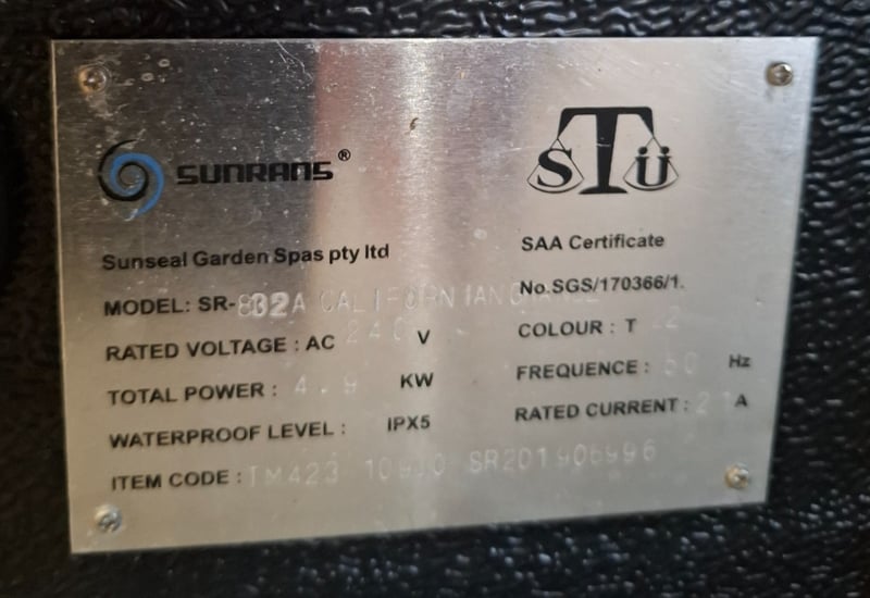 DISPLAY--CALI GRANDE 2800 * 2200 * 90Model: SR832 Californian GrandeRated Voltage: 240VTotal Power: 4.9KWWaterproof Level: IPX5No. SGS/170366/1.Colour T22Frequence: 50HzRated Current: 21AItem Code: TM423 10930 SR 201 906996