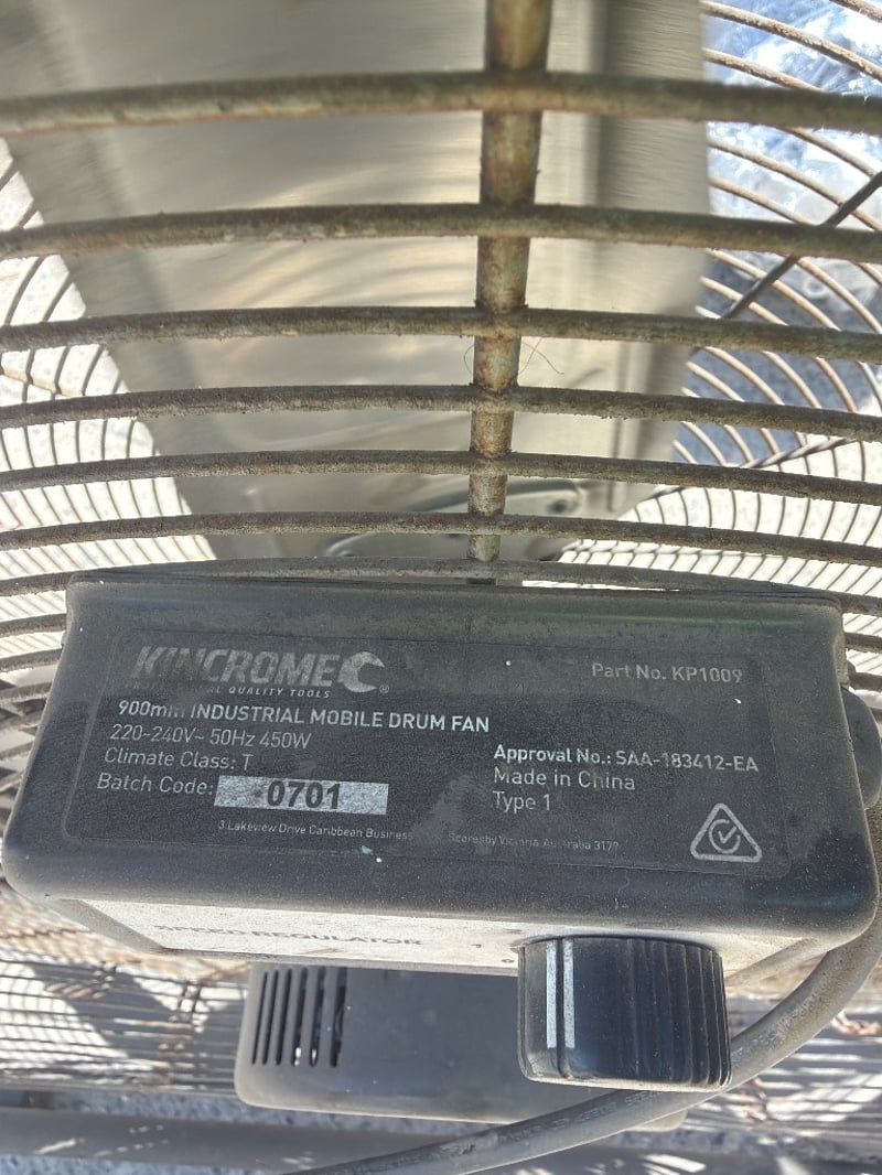 Kingchrome Industrial Fan Batch Code : 0701 Part No. KP1009 Notes: Working Condition Location: Warragamba, NSW Contact: Jonathan Naime - 0400 733 207 Collections: Monday 1st to Wednesday 3rd December - 9am to 4pm