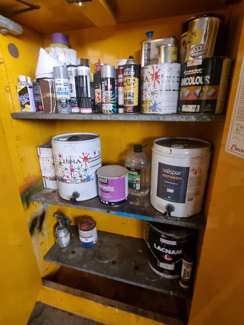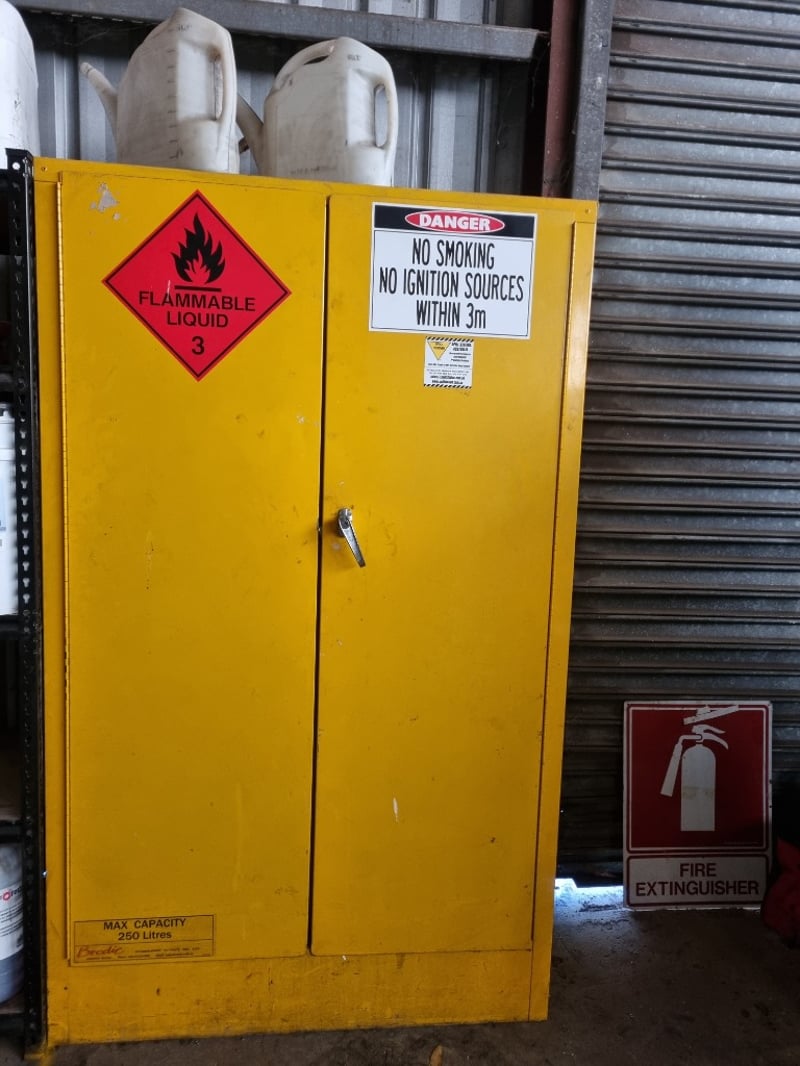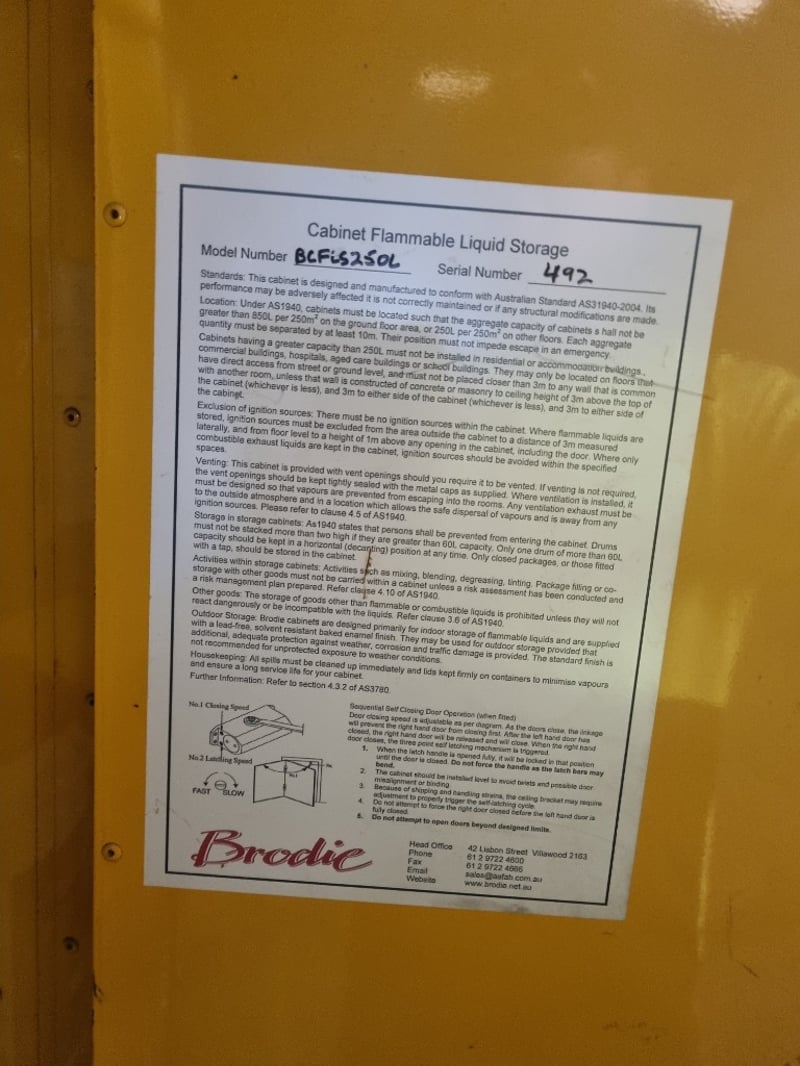 Brodie Flammable Storage Cabinet Yellow 250L Capacity Contents Included : Paint Thinners , Spray Paint , Primers & more Cabinet Dimensions: 1100W x 1830Hx 540D Sold as Lot Location: Warragamba, NSW Contact: Jonathan Naime - 0400 733 207 Collections: Monday 1st to Wednesday 3rd December - 9am to 4pm