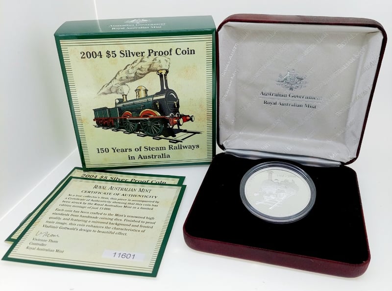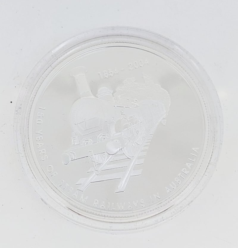 2004 150 YEARS OF STEAM RAILWAYS IN AUSTRALIA $5 SILVER PROOF COIN488239+43